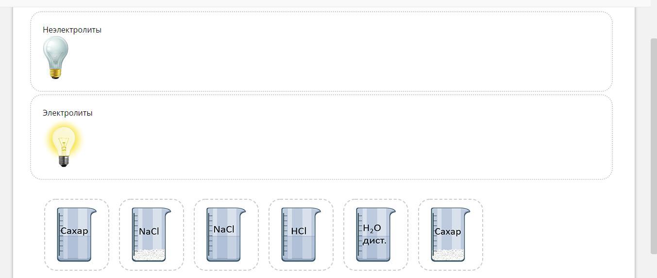 Неэлектролиты - это сахар (раствор), сахар (кристаллический), дистиллированная вода и NaCl (кристаллический)