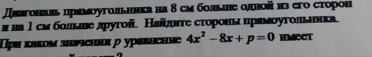 Диагональ прямоугольника на 8 см больше одной из его сторон и на 1 см больше другой . Найдите стороны прямоугольника. При каком значении р уровнение 4х в квадрате - 8х + р = 0