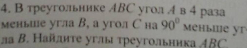 С условия дано, что В= х, А= х/4, С= (х-90), поскольку сумма углов в треугольнике 180 то можно сложить уровнение: