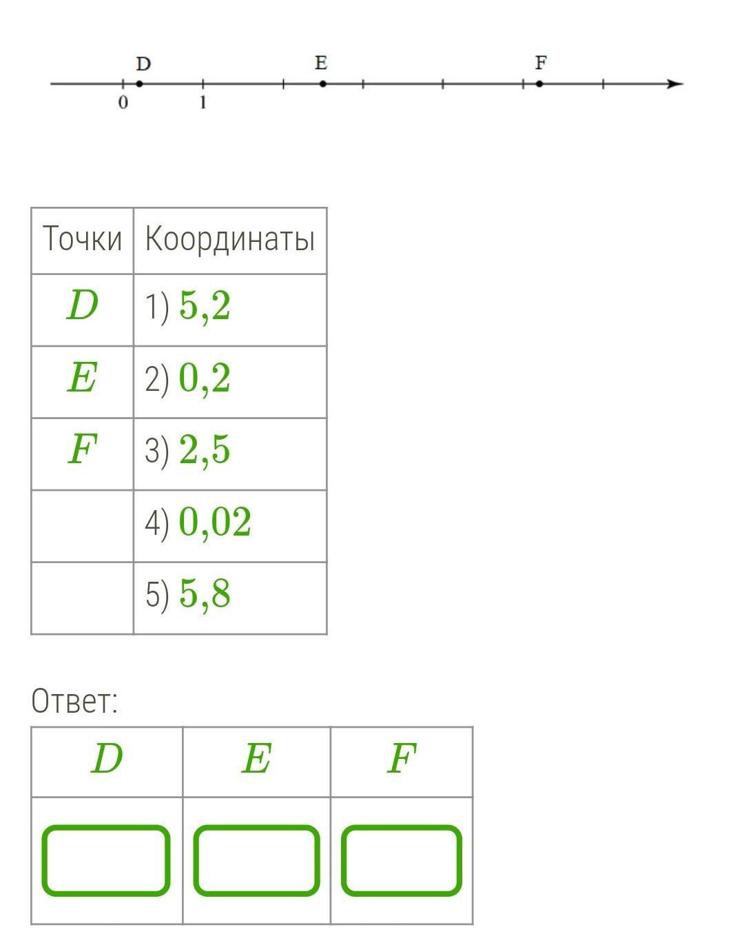 На координатной прямой отмечены точки D, E, F. Установи соответствие между точками и их координатами (в поле ответов впиши только номер ответа без скобок).