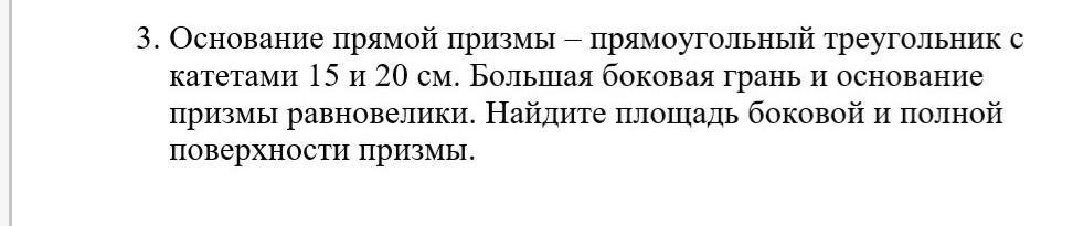 большая боковая грань прямоугольник площадью 150 см² и основанием 25 см, тогда вторая сторона боковой грани (высота прямой призмы) равна 150/25=6 см;