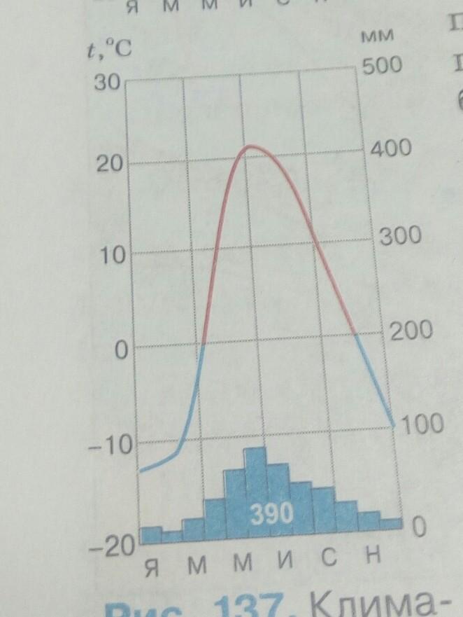 Это умеренный, субполярный или полярный пояса. Так как появляются отрицательные температуры .в зимнее время осадков мало, а 2/3 осадков выпадает летом, то это муссонный климат. понижение температуры (зима) в январе – это климатограмма северного полушария; (( но это не 1000000% ))