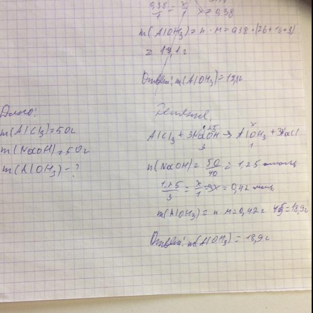 Вычислить массу остатка , образовавшегося при взаимодействии 50 г. хлорида алюминия с 50 г. гидроксида натрия