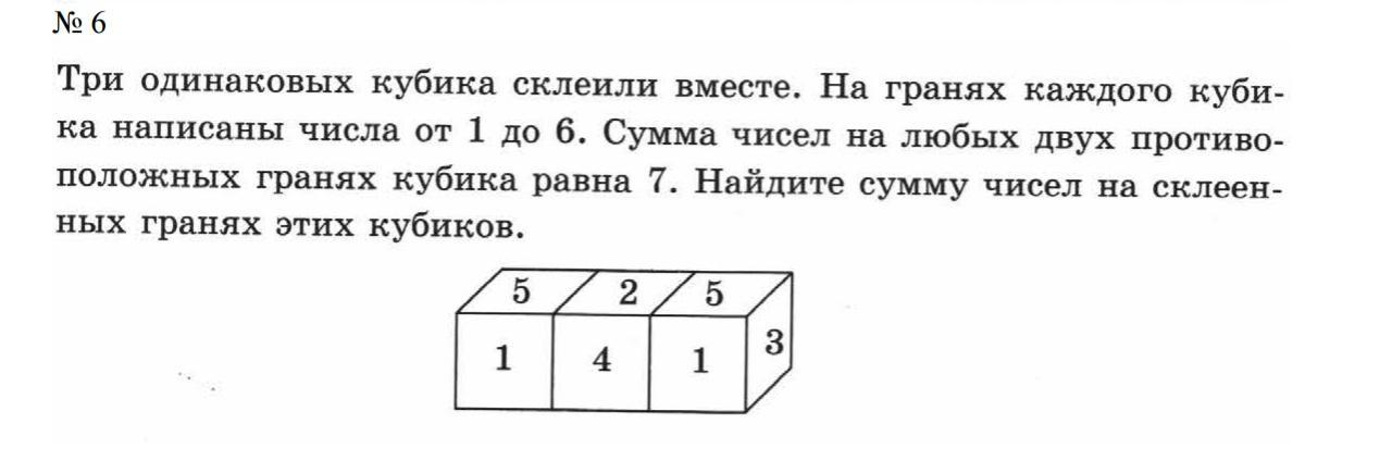 Окей, если правая сторона склеенных кубов равна 3, то ей противоположная равна 4. Следующая точно так же равна 3, а последующая равна 4. И мы получаем 4+4+3+3=14.