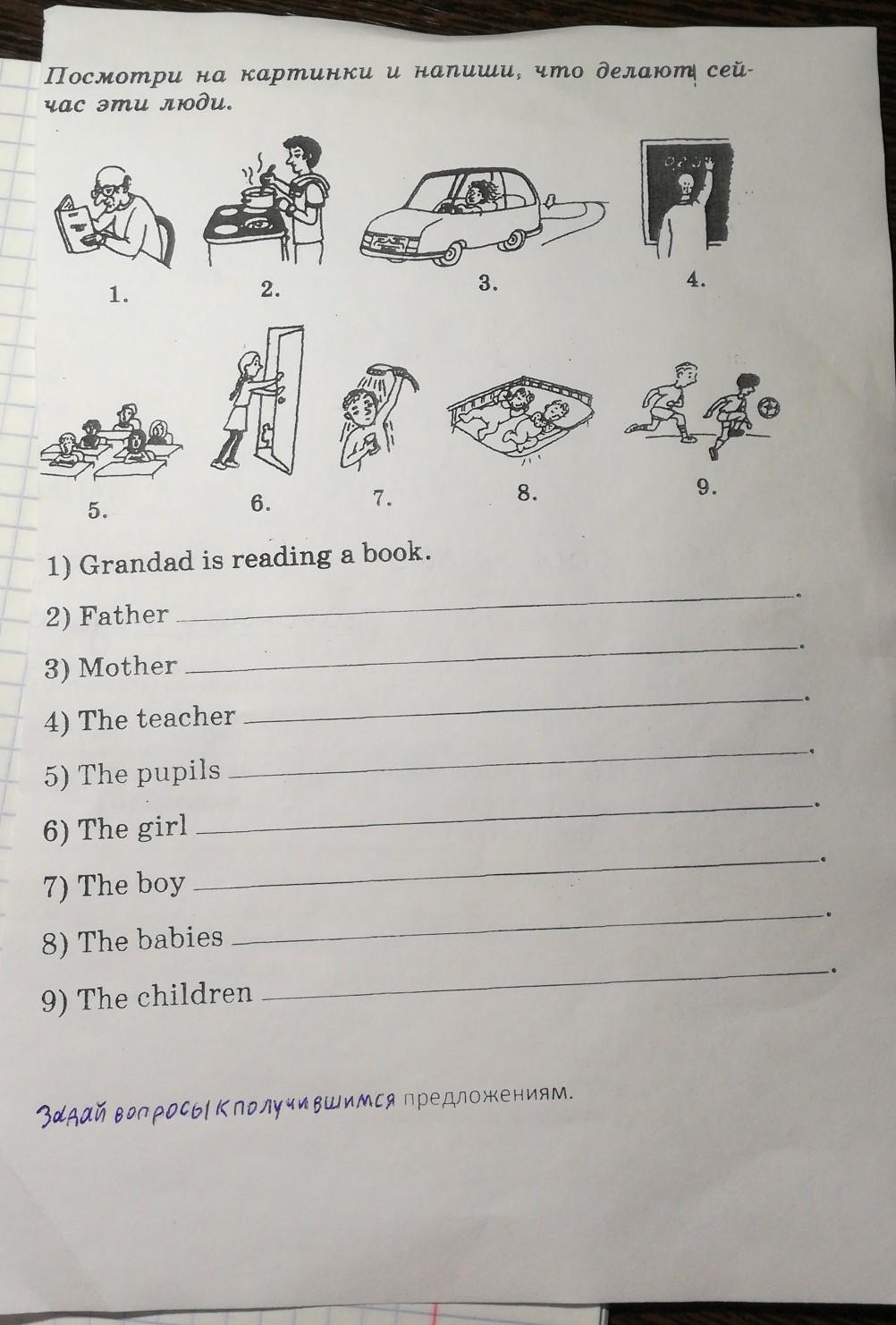 нужно задать вопросы, к примеру, что делает отец? отец готовит завтрак