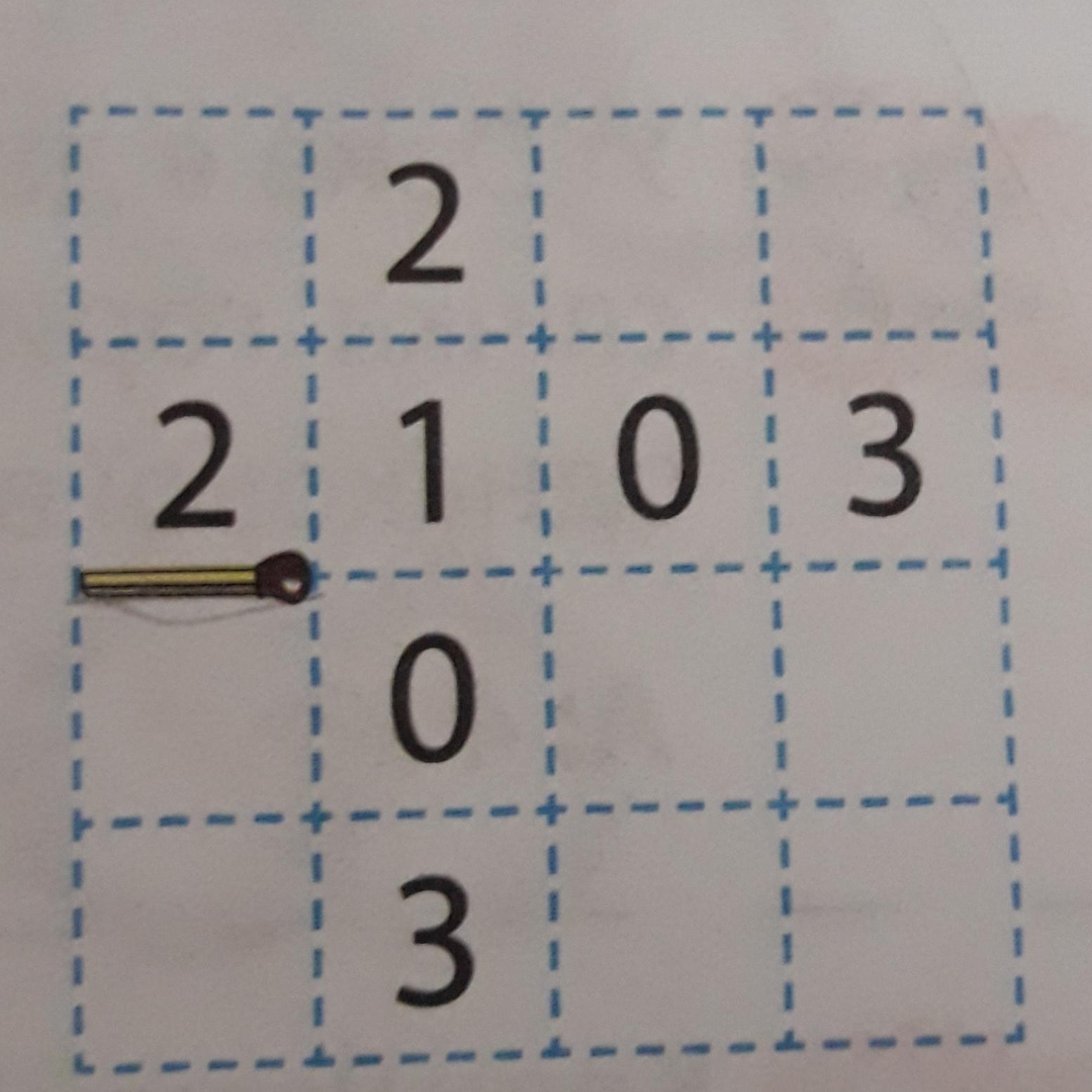 Олена будує замкнуту ламану з сірників. Вона кладе кожен сірник на аркуші паперу на одній з пунктирних ліній, як це показано на малюнку. Перший сірник уже лежить на аркуші, а останній має прилягати до лівого кінця першого сірника. У деяких клітинках поставлені числа, що дорівнюють кількості сірників навколо цієї клітини. Яку найменшу кількість сірників використає Олена?