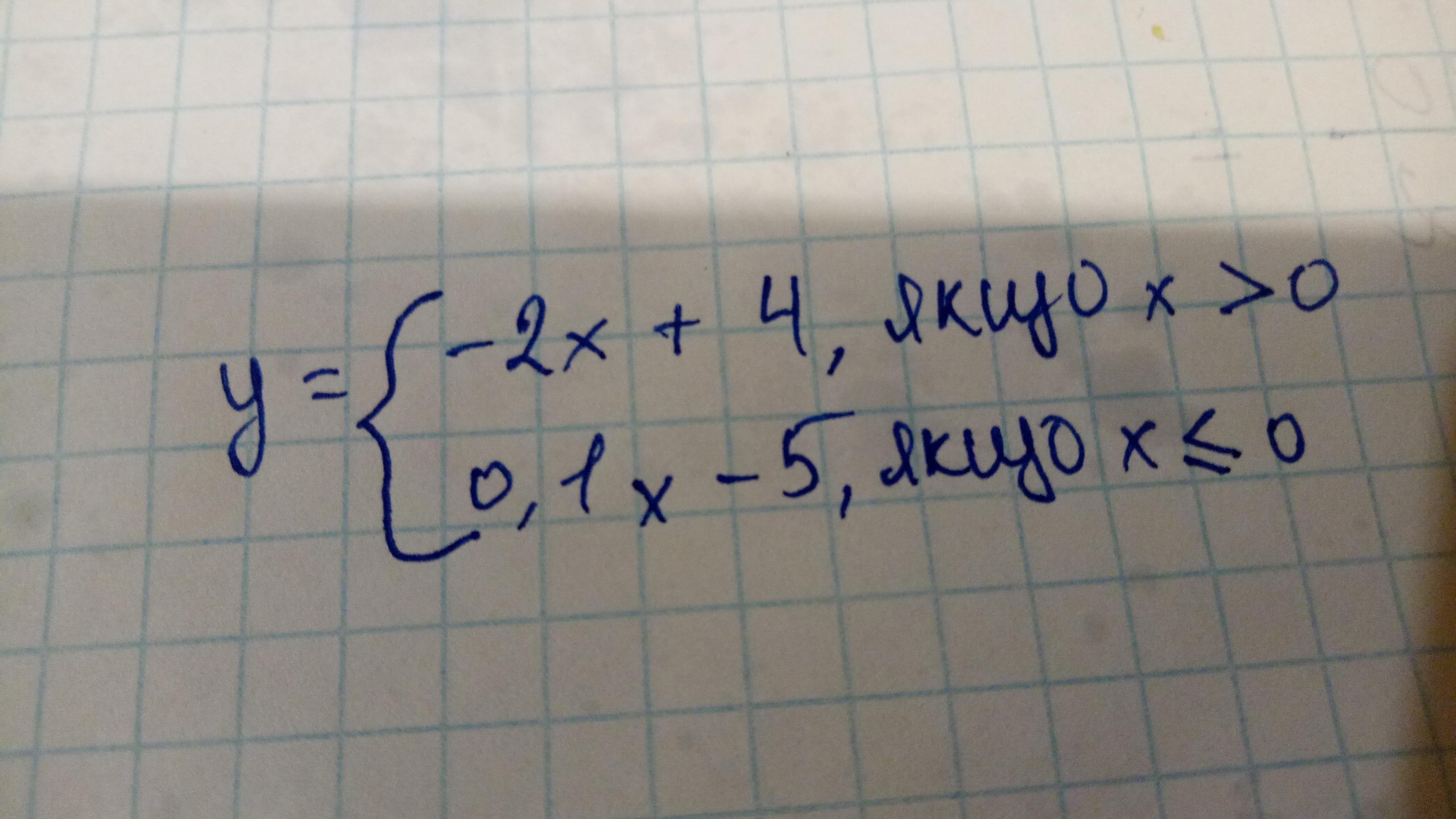 Графік даної функції співпадає з графіком функції у = -2х + 4, при x>0 і з графіком функції у = 0,1х - 5, при х≤0.