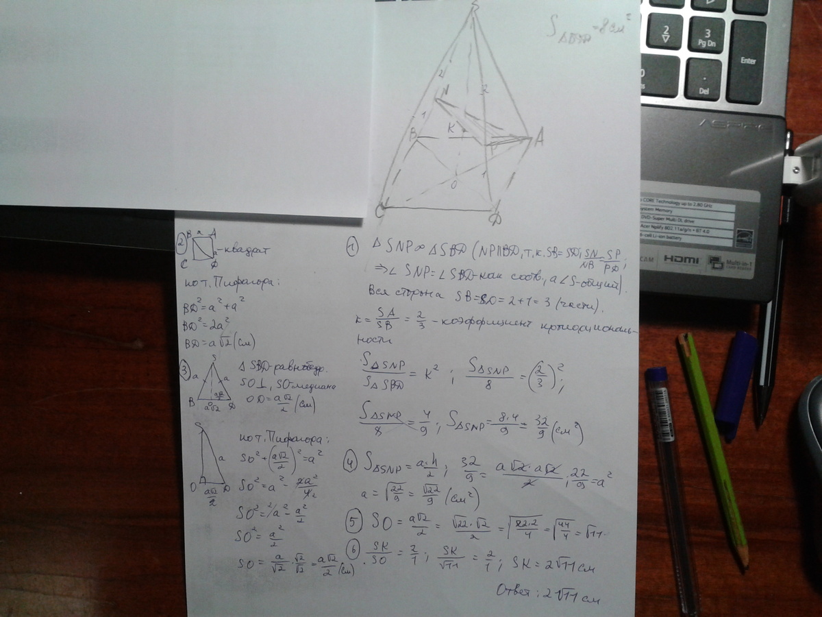 Дана Правильная пирамида SABCD длины рёбер равны. Точки N и P лежат на SB и SD, так что SN:NB=SP:PD=2:1. Постройте X точку пересеченя ( ANP) i SC.Найти SK если площадь треугольника BSD равна 8см^2