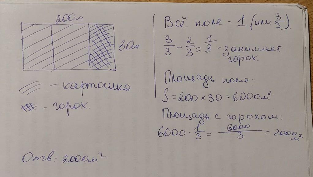 Длина поля 200 м , а ширина 30 м . 2/3 площади поля занимает картофель . Остальную площадь занимает горох . Какую площадь поля занимает горох ?