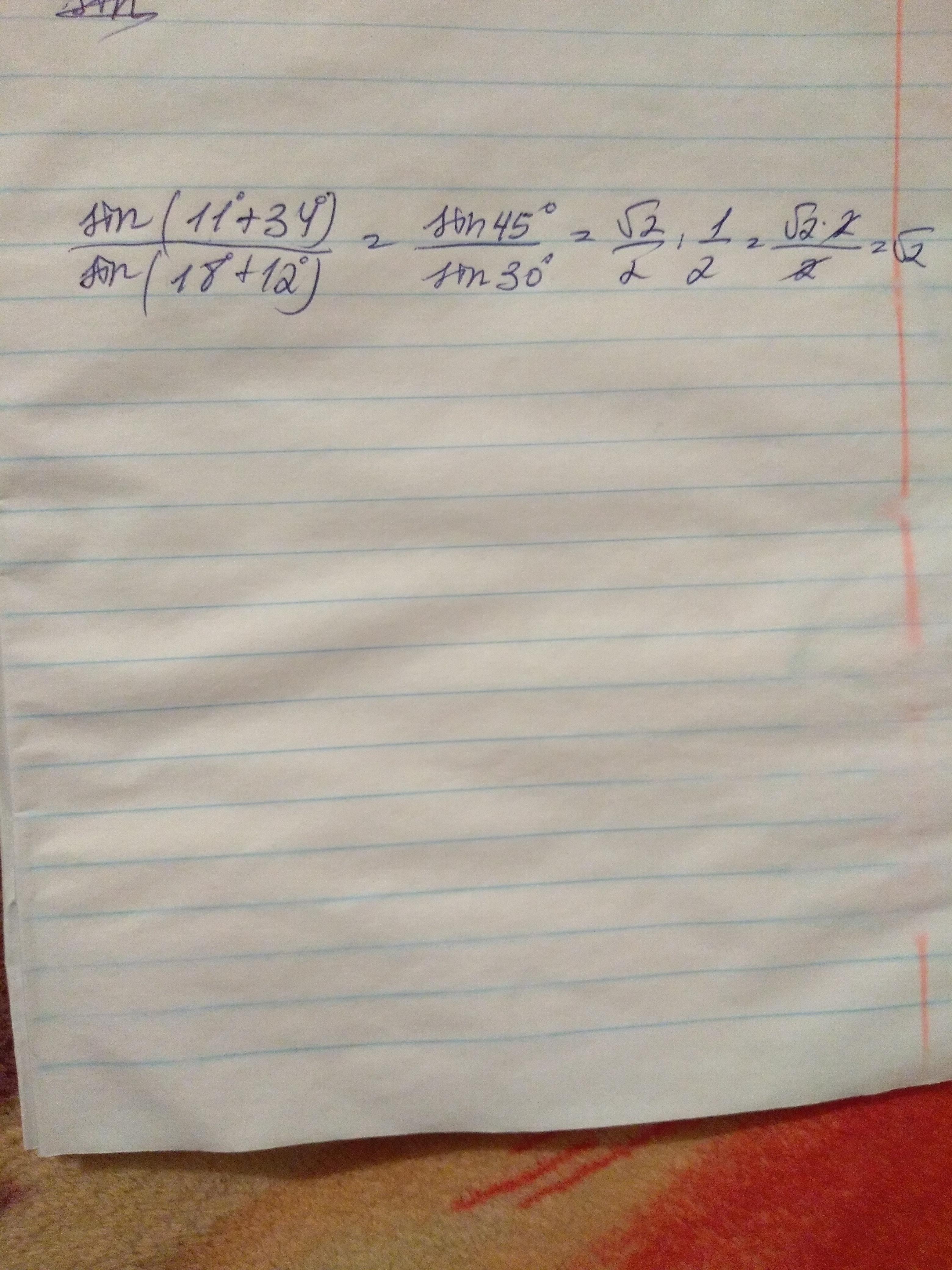 sin 11*•cos34*+cos11*•sin34* / sin18*•cos12*+cos18*•sin12* =