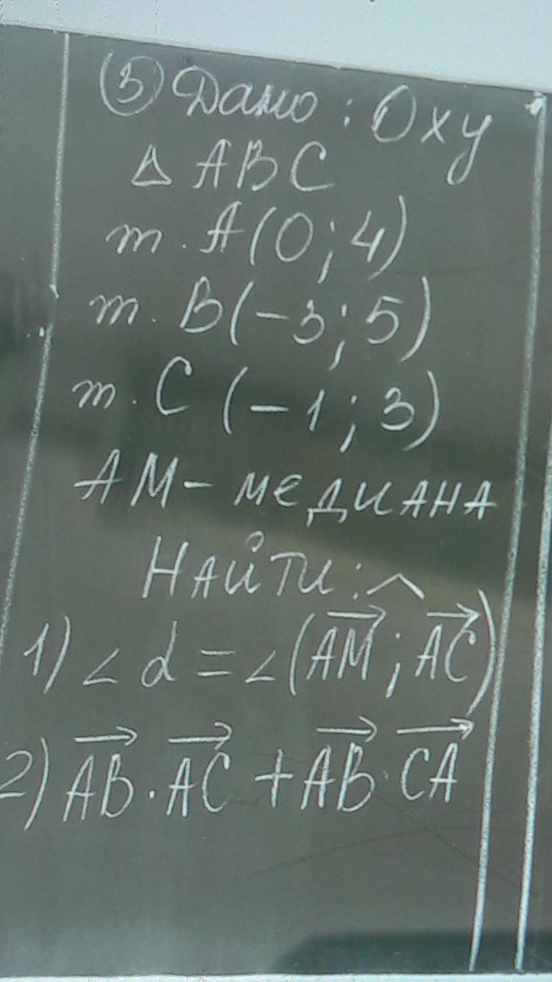 Координаты вектора АМ: (-2-0; 4-4) =(-2;0); координаты вектора АС: (-1-0; 3-4)=(-1;-1). Найдём скалярное произведение этих векторов: -2*(-1)+0*(-1)=2. Тогда угол между векторами можно найти как отношение между скалярным произведением и произведением длин этих векторов: