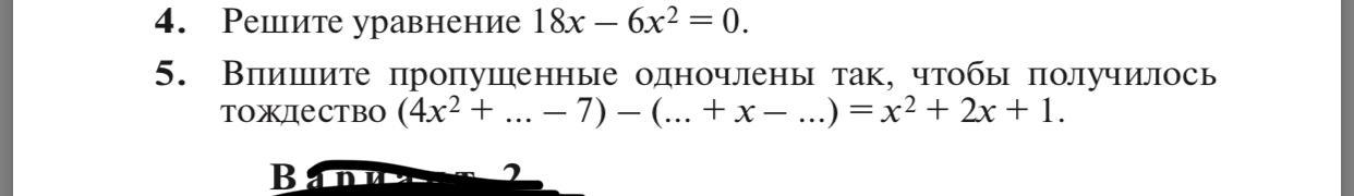 4. : 18x - 6 {x}^{2}  = 0 \ 6x(3 - x) = 0 \ x = 0 : x = 3 \  \ 5. \ 4 {x}^{2}  - a =  {x}^{2}  \ a =  {4}^{2}  -  {x}^{2}  = 3 {x}^{2}  \ b - x = 2x \ b = 2x + x = 3x \  - 7 + c = 1 \ c = 7 + 1 = 8