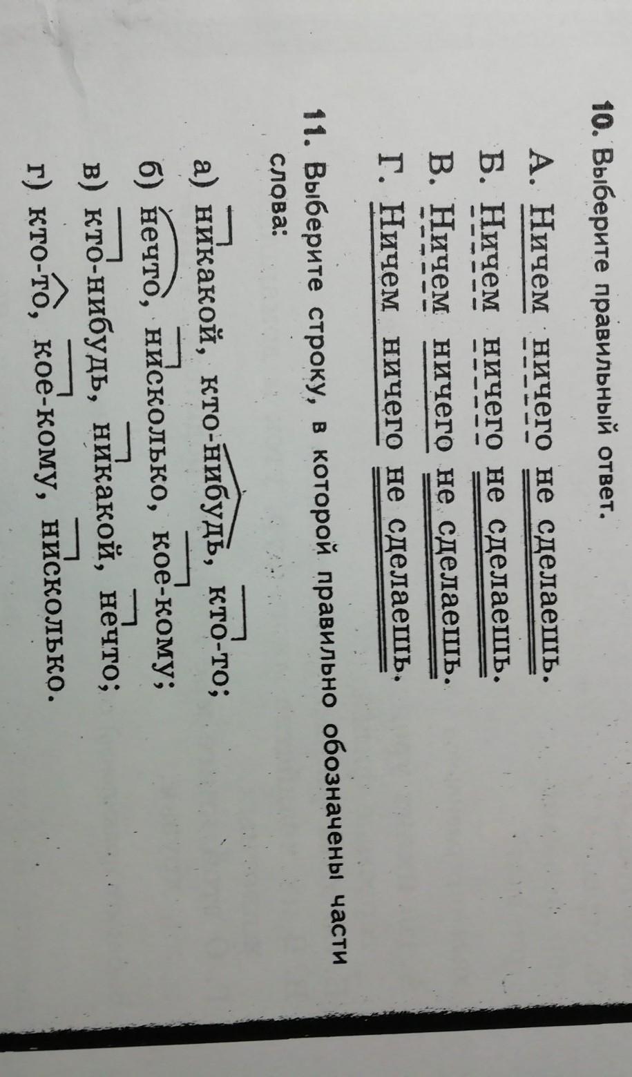 10. Подлежащего нет, подразумевается слово "ты" - ничем ничего ты не сделаешь. Остальные слова дополнения, ответ б)