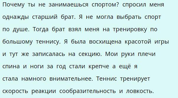 Почему ты не занимаешься спортом?- спросил меня однажды старший брат. Я не могла выбрать спорт по душе. Тогда, брат взял меня на тренировку по большому теннису. Я была восхищена красотой игры и тут же записалась на секцию. Мои руки, плечи, спина и ноги за год стали крепче, а ещё я стала намного внимательнее. Теннис тренирует скорость реакции, сообразительность и ловкость.
