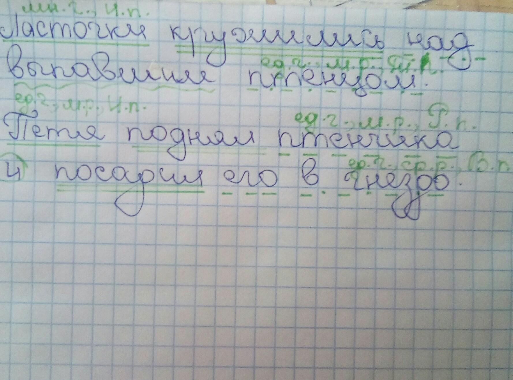 Ласточки (ж.р. Мн.ч И. п.) кружились над выпавшим птенцом (м.р ед.ч Т. п.). Петя (м.р ед.ч И. п.) поднял птенчика(м.р. ед.ч. В. п.) и посадил его в гнездо (ср.р ед.ч. В. п.).