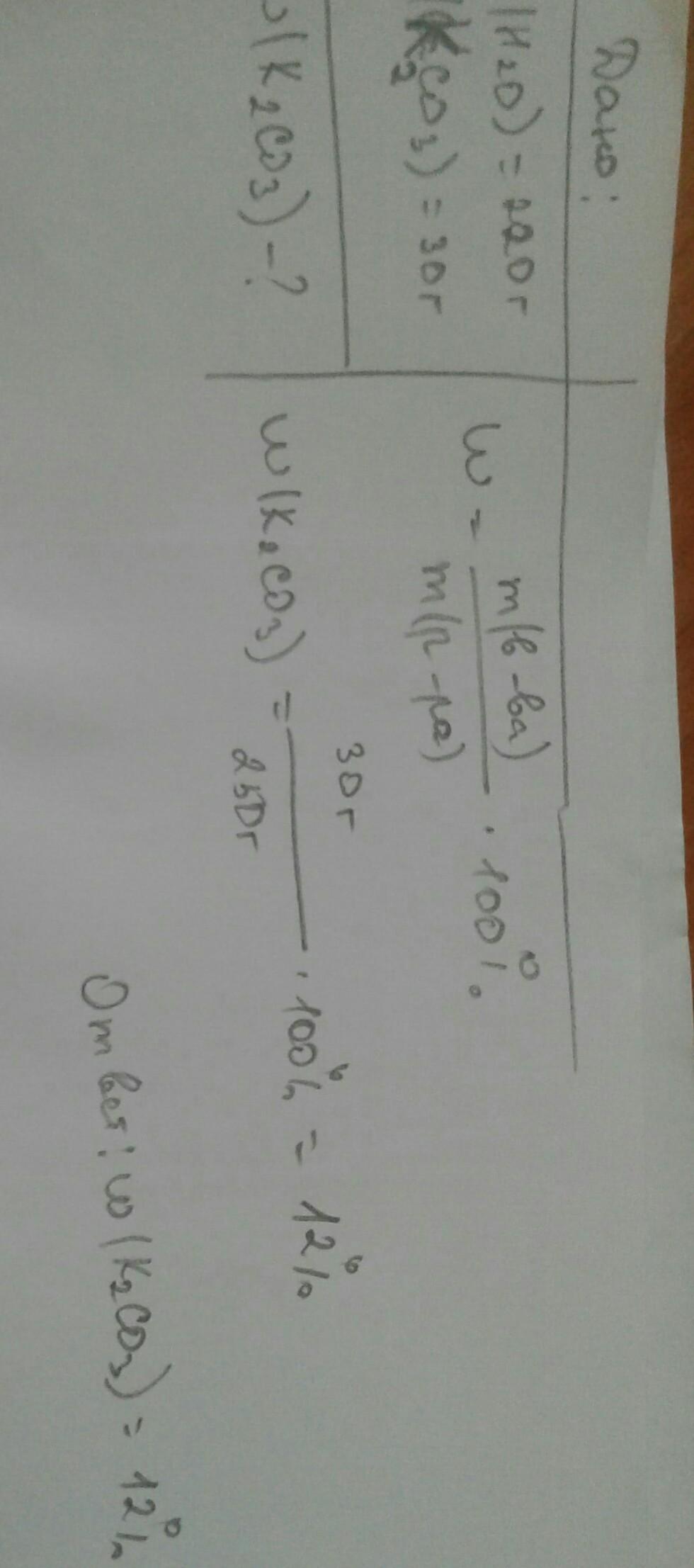 В 220 г воды растворено 30 г карбоната калия. Определите массовую долю карбоната натрия в полученном растворе