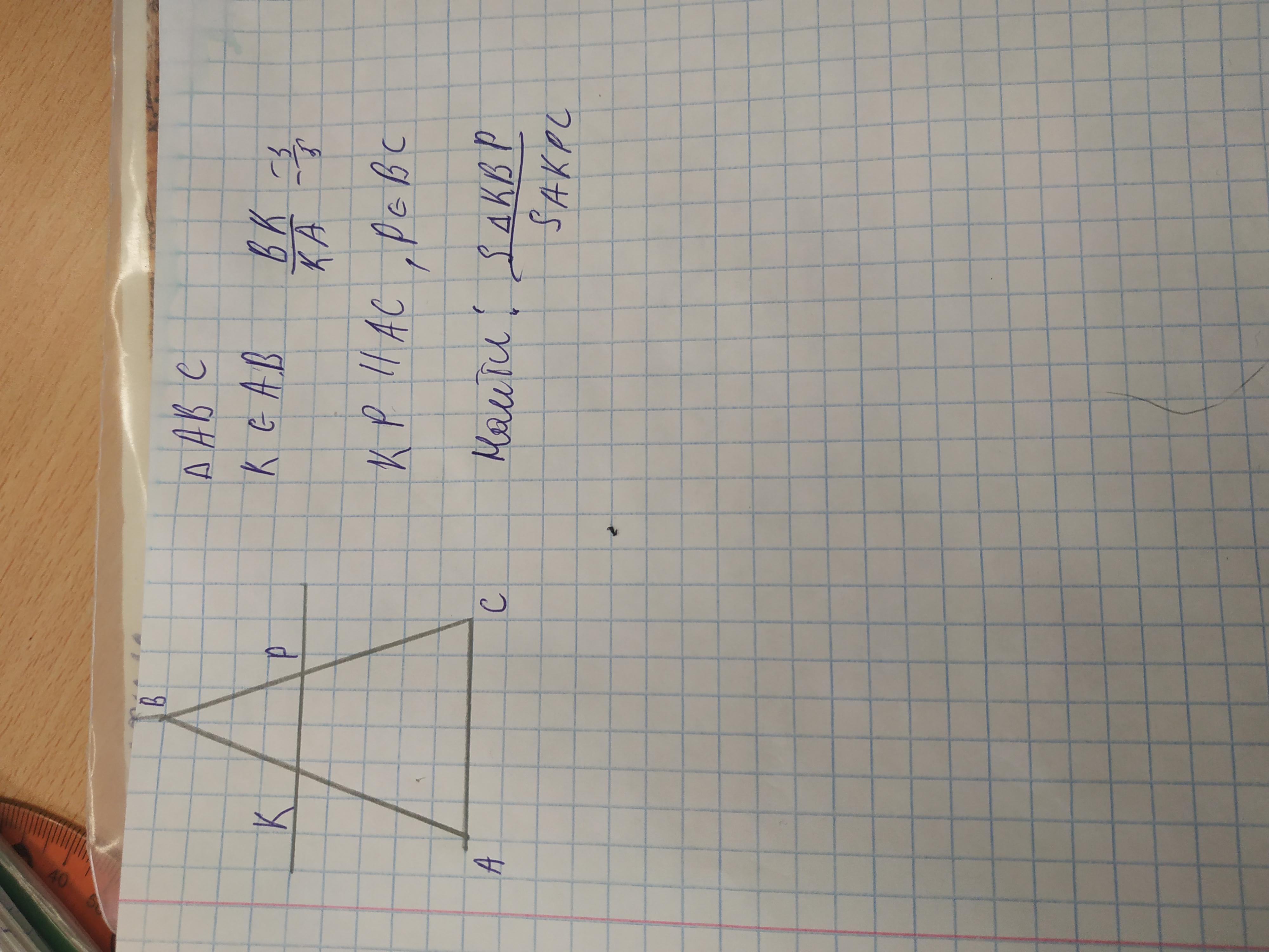 Так как ВК/АК=3/5, то ВК/ВА =3/8=k - коэффициент подобия треуг. Площади треугольников относятся как k^2, т.е. S(KBP)/S(ABC) =(3/8)^2=9/64.