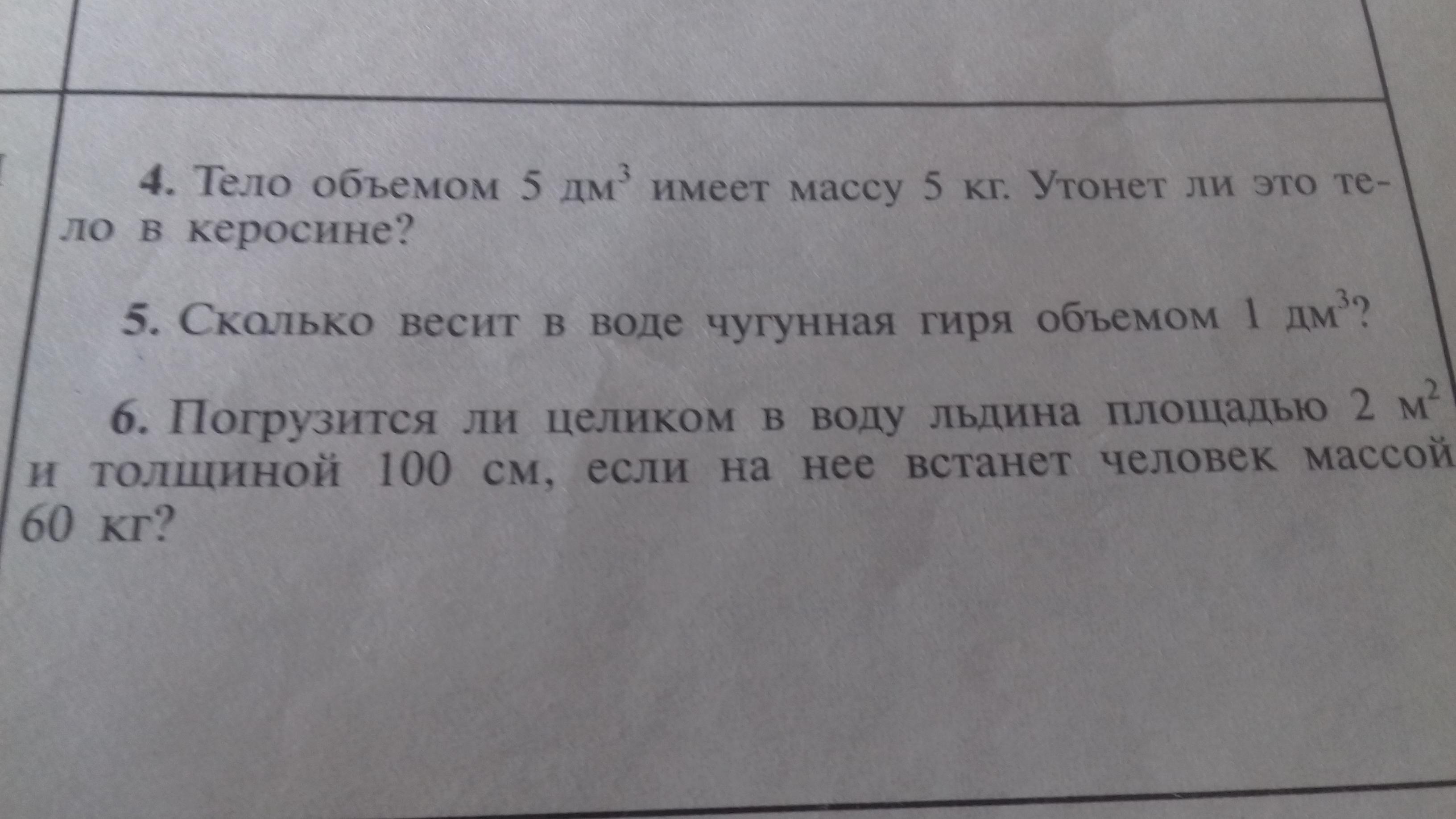 Значит тело размером 5дм в кубе имеющее массу 5 кг утонет в керосине