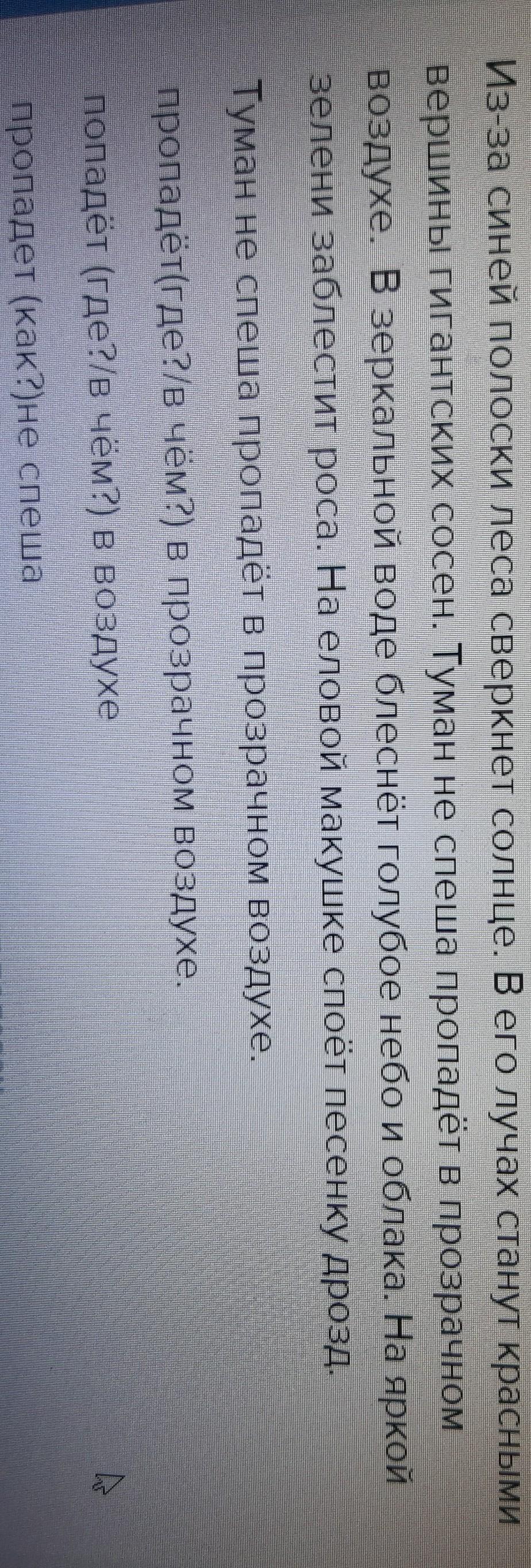 Из-за синей полоски леса, сверкнет солнце. В его цах станет красными вершины гигантских сосен. Туман не спеша пропадет в прозрачном воздухе. Оперкальная вода блеснет голубое небо и облака. На яркой зелени заблестит роса. Не еловой макушке споет песенку дрозд.