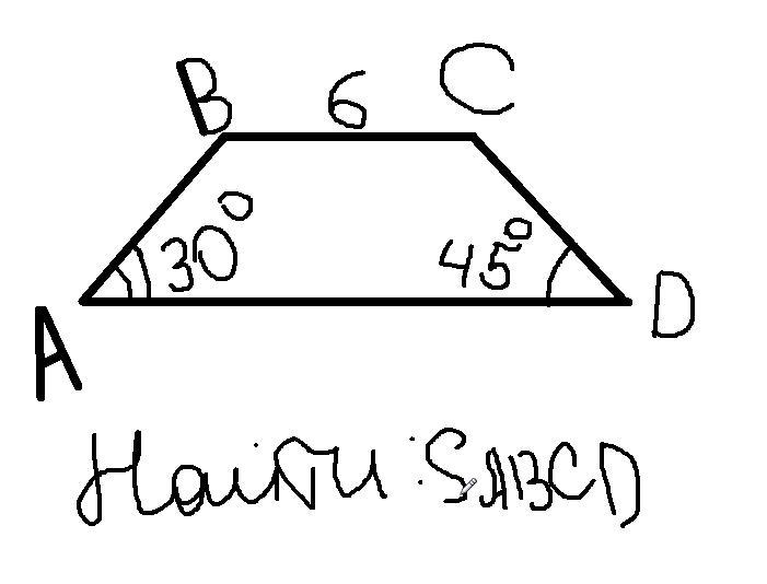 Проведём две высоты: BH1 и CH2. BH1 будет равна 8, так как она лежит напротив угла в 30 градусов и равна половине гипотенузы. Очевидно, что BH1=CH2=8 (перпендикуляры проведены к одной стороне, значит они параллельны. BC и AD тоже параллельны. Значит H1BCH2 параллелограм и отсюда вытекает равенство). Тогда CH2=DH2=8 (прямоугольный равнобедренный треугольник). BC будет равно H1H2=6 (H1BCH2 параллелограм). AH1=AB*cos30=16*sqrt3 /2=8*sqrt 3.