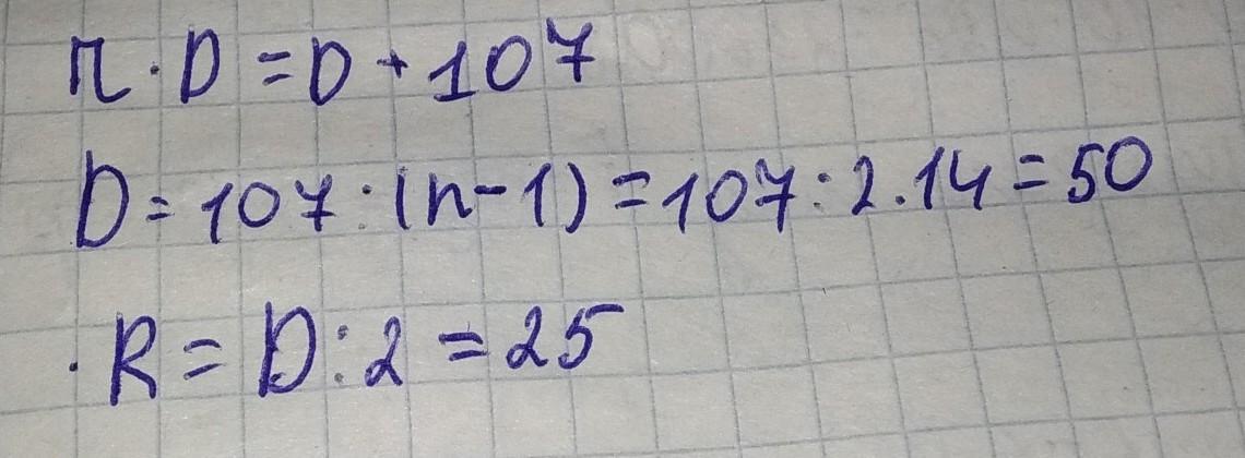 Откуда радиус окружности R = D / 2 = 107 / 2( π - 1 ) ≈ 24,98 см