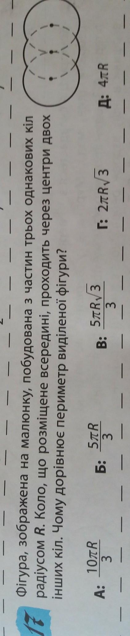 Фігура, зображена на малюнку, побудована з частин трьох однакових кіл радіусом R. Коло, що розміще всередині, проходить через центри двох інших кіл. Чому дорівнює периметру виділеної фігури?