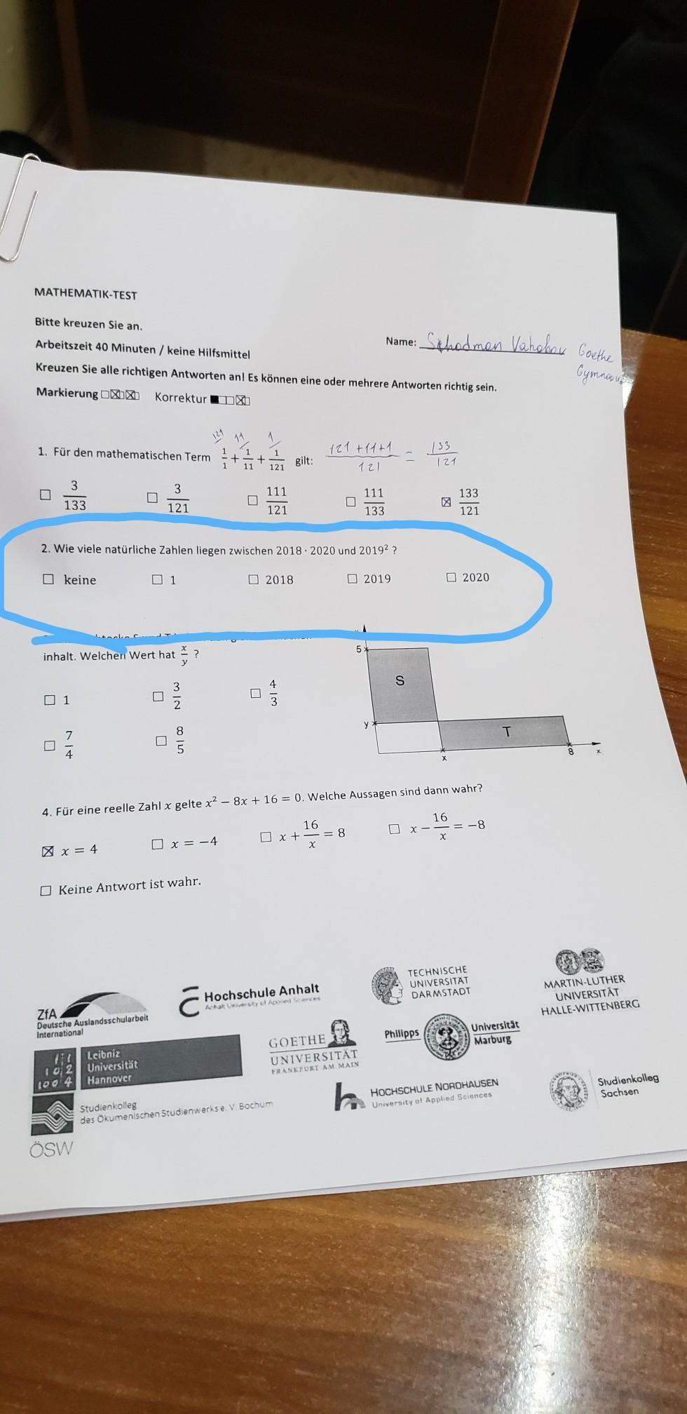 Сколько натураьных чисел лежат между 2018×2020 и 2019^2?