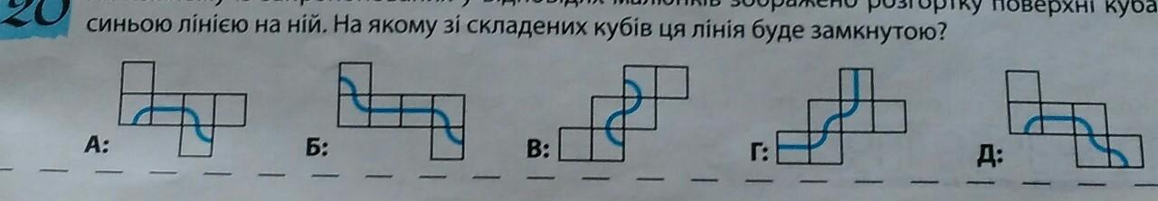 на кожному із запропонованих у відповідях малюнків зображено розгортку поверхні куба із синьою лінією на ній.На якому зі складених кубів ця лінія буде замкнутою?Очень нужно!!