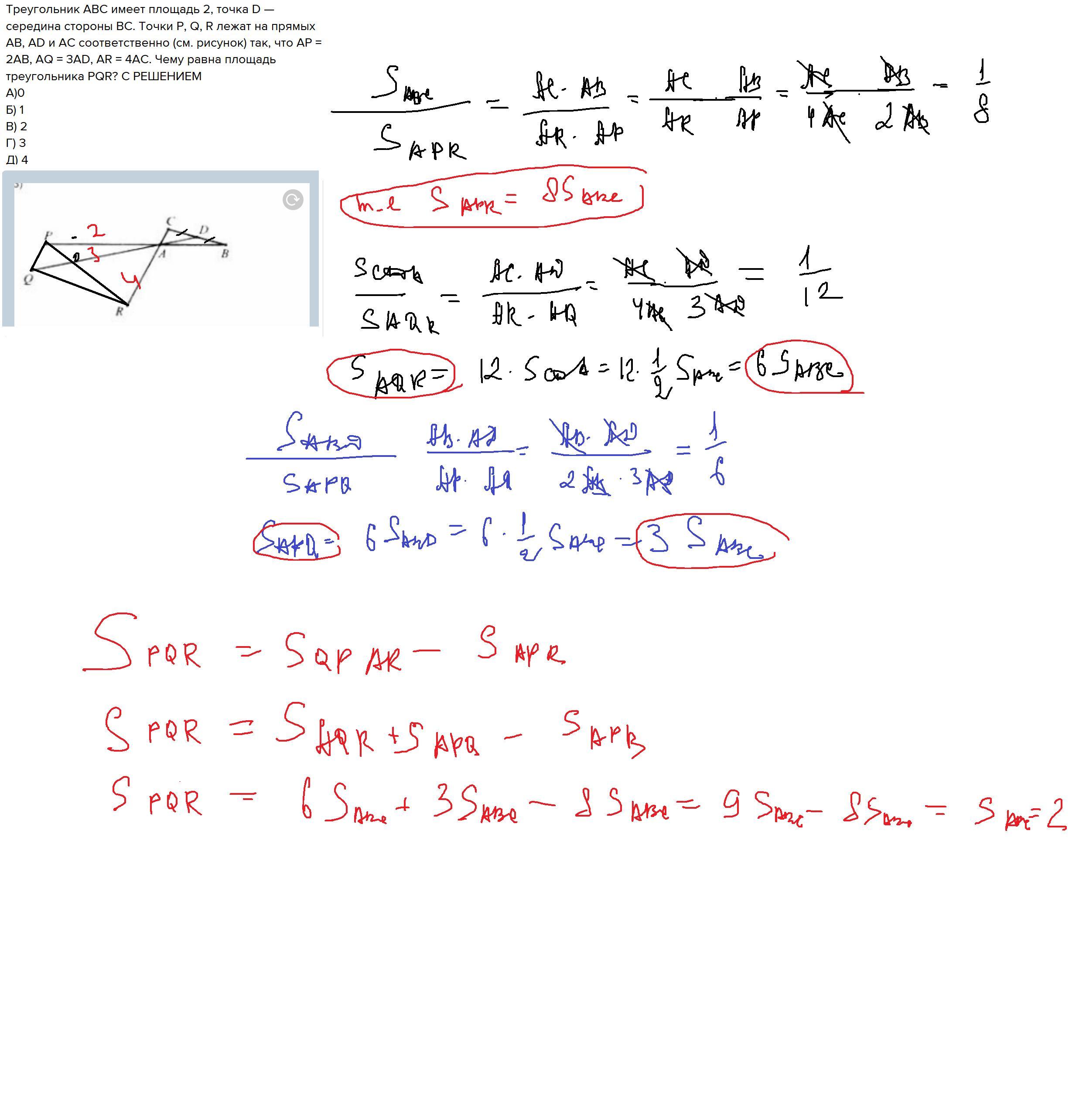 Треугольник ABC имеет площадь 2, точка D — середина стороны BC. Точки P, Q, R лежат на прямых AB, AD и AC соответственно (см. рисунок) так, что AP = 2AB, AQ = 3AD, AR = 4AC. Чему равна площадь треугольника PQR? С РЕШЕНИЕМ