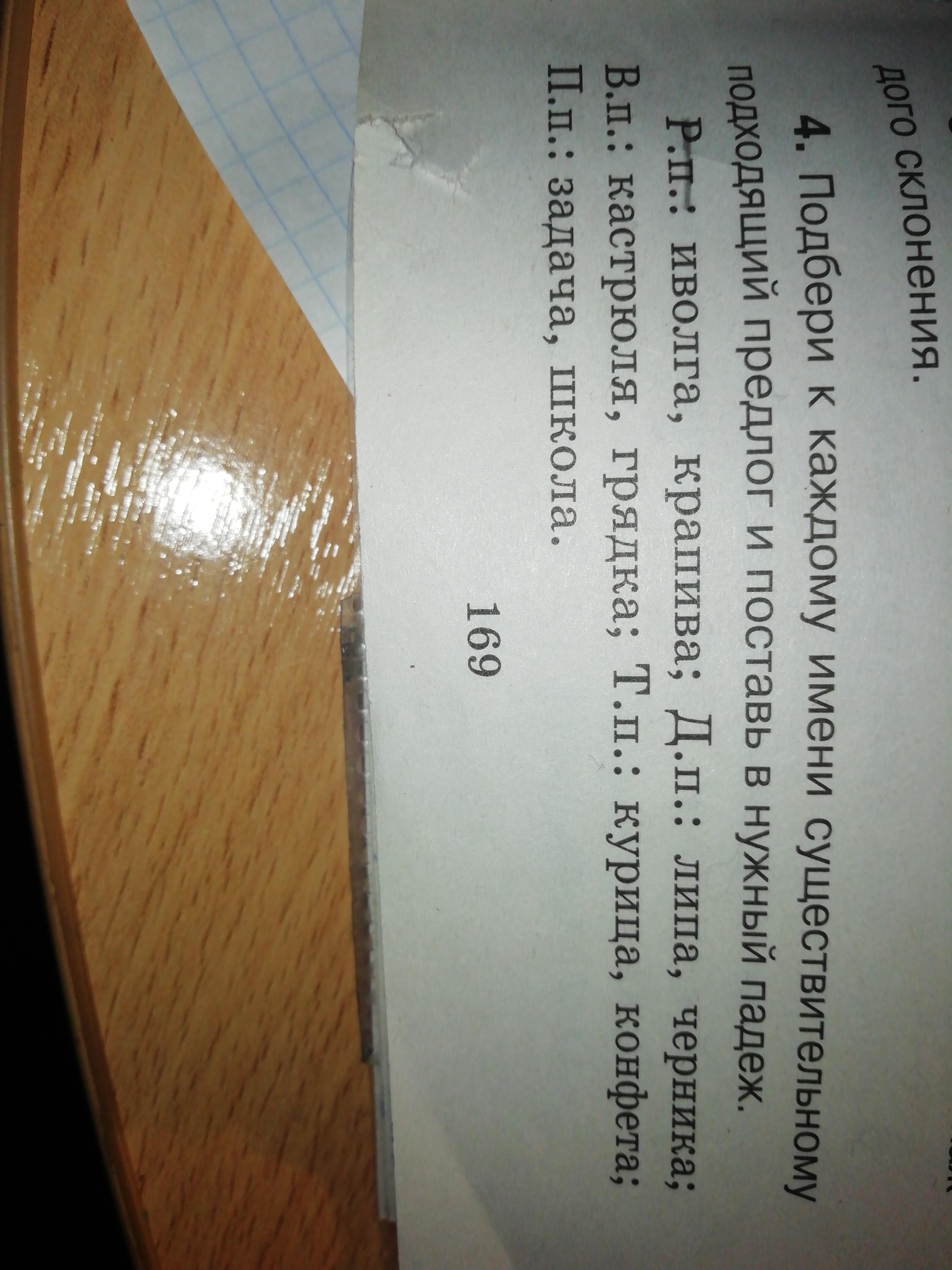 Р. П. : с иволги, с крапивы. Д. П. : о липе, о чернике. В. П. : в кастрюлю, в грядку. Т. П. :с курицей, с конфетой. П. П. :о задаче, о школе