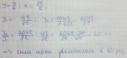 Напряжение на концах проводника увеличили в 10 раз, а длину проводника уменьшили в 2 раза. Определить, во сколько раз изменилась сила тока в проводнике, если его площадь поперечного сечения осталась неизменной
