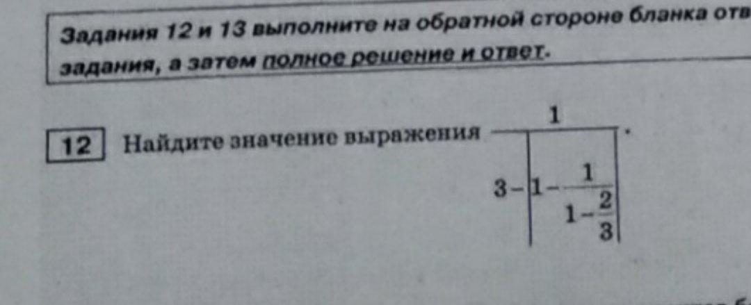 frac{1}{3-|1-frac{1}{1-frac{2}{3} }| }=frac{1}{3-|1-frac{1}{frac{1}{3} }| }=frac{1}{3-|1-3|}=frac{1}{3-|-2|}=frac{1}{3-2}=frac{1}{1}=1