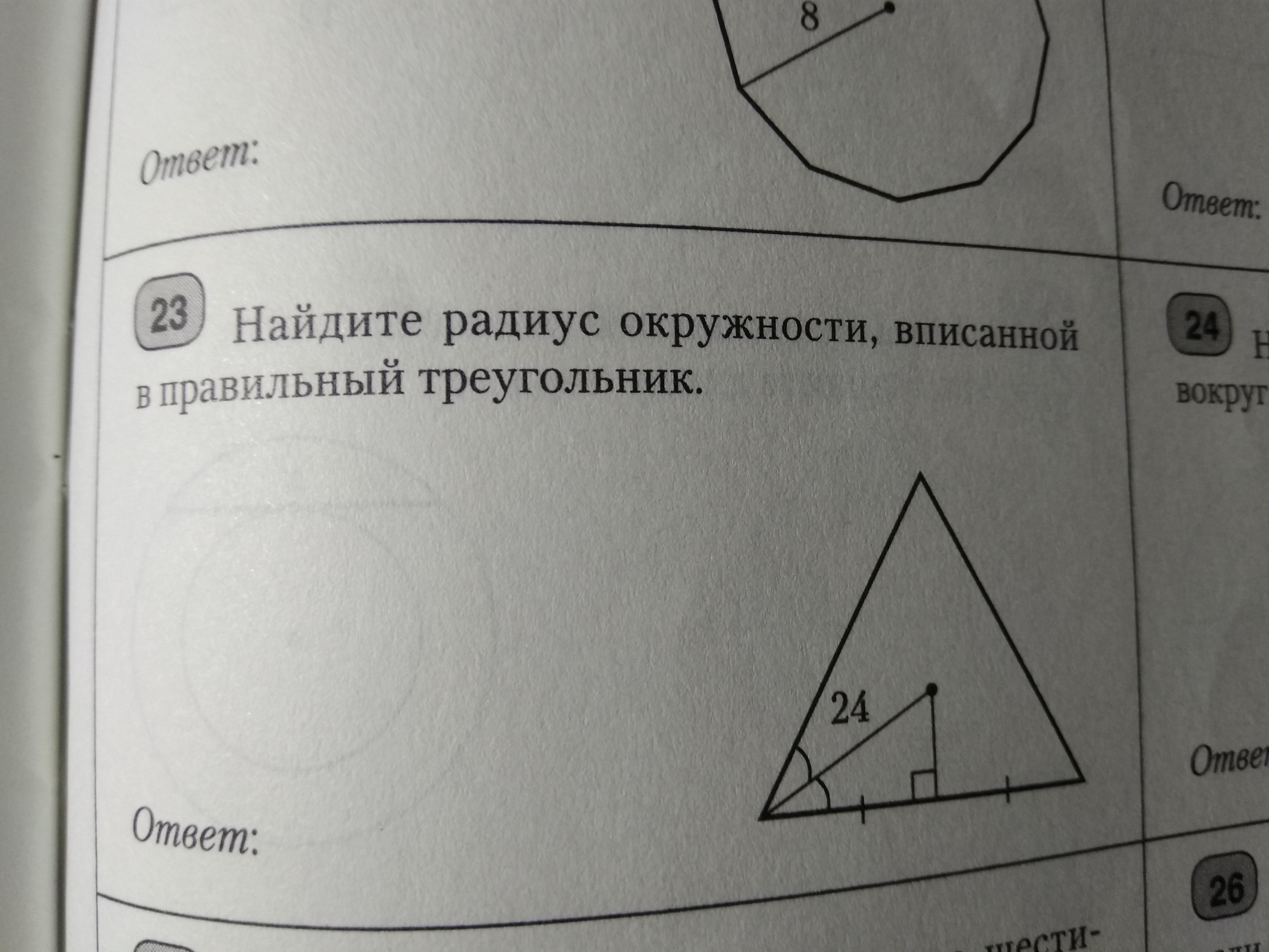 3. В равностороннем треугольнике каждый угол равен 60°. Тогда половина угла — 30°. Из маленького прямоугольного треугольника: гипотенуза равна 24 см, один из острых углов 30°, тогда по свойству катета лежачего напротив угла 30° (который равен половине гипотенузы) радиус вписанной окружности, которым и является этот катет, равен 12 см.
