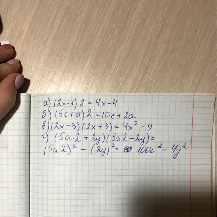 Преобразуйте в многочлен: а) (2х - 1)2; в) (2x – 3)(2x + 3); б) (5c + а)2; г) (5a 2 + 2у)(5a 2 – 2у).