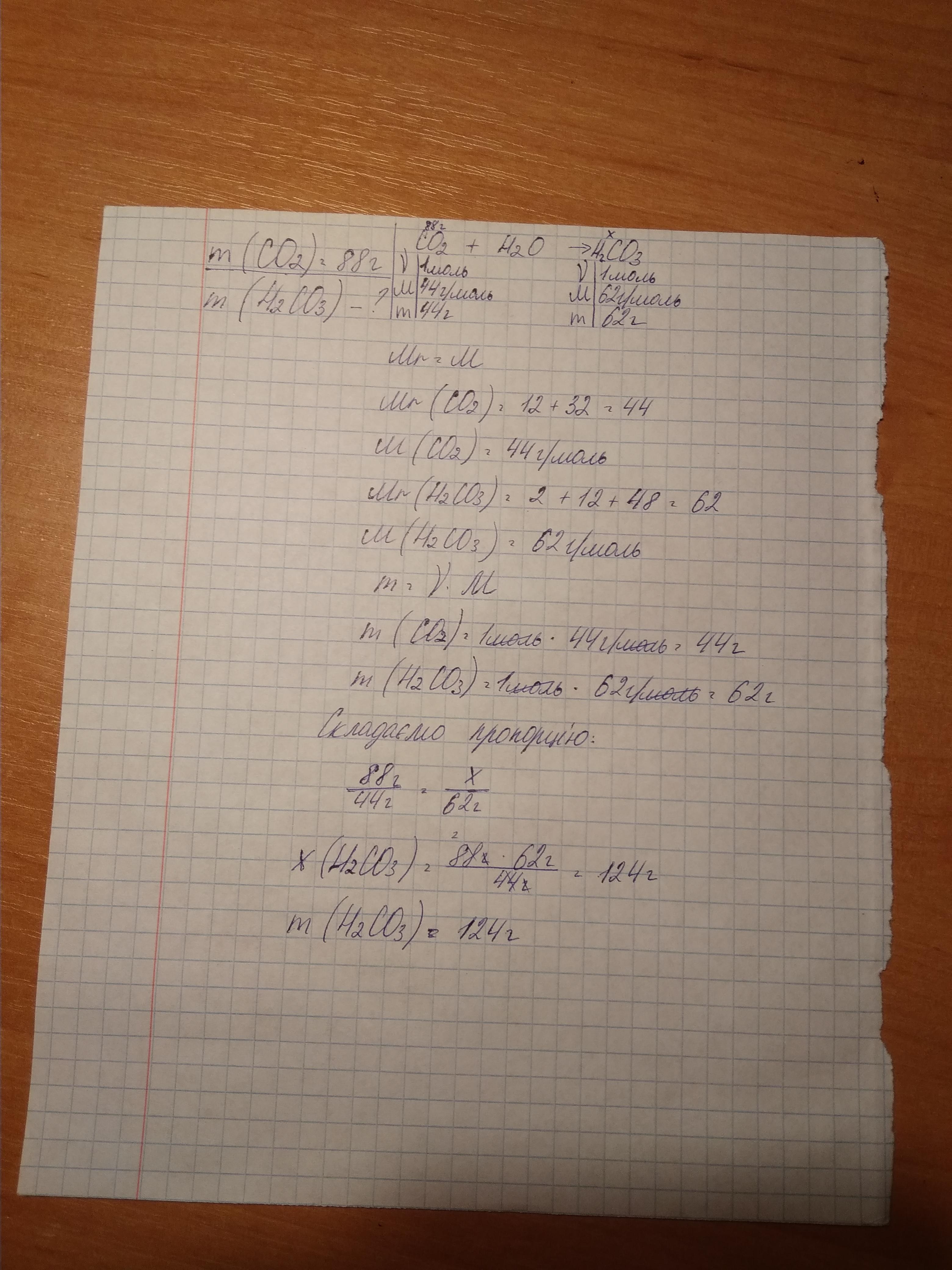 Відповідь: маса карбонатної кислоти, яка утворилася в результаті взаємодії CO₂ та H₂O дорівнює 124 г