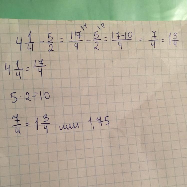 4 1/4 - 5/2= 4 1/4 - 5/2 * 2= 4 1/4 - 10/4= 1 13/4 - 10/4= 1 целая 3/4