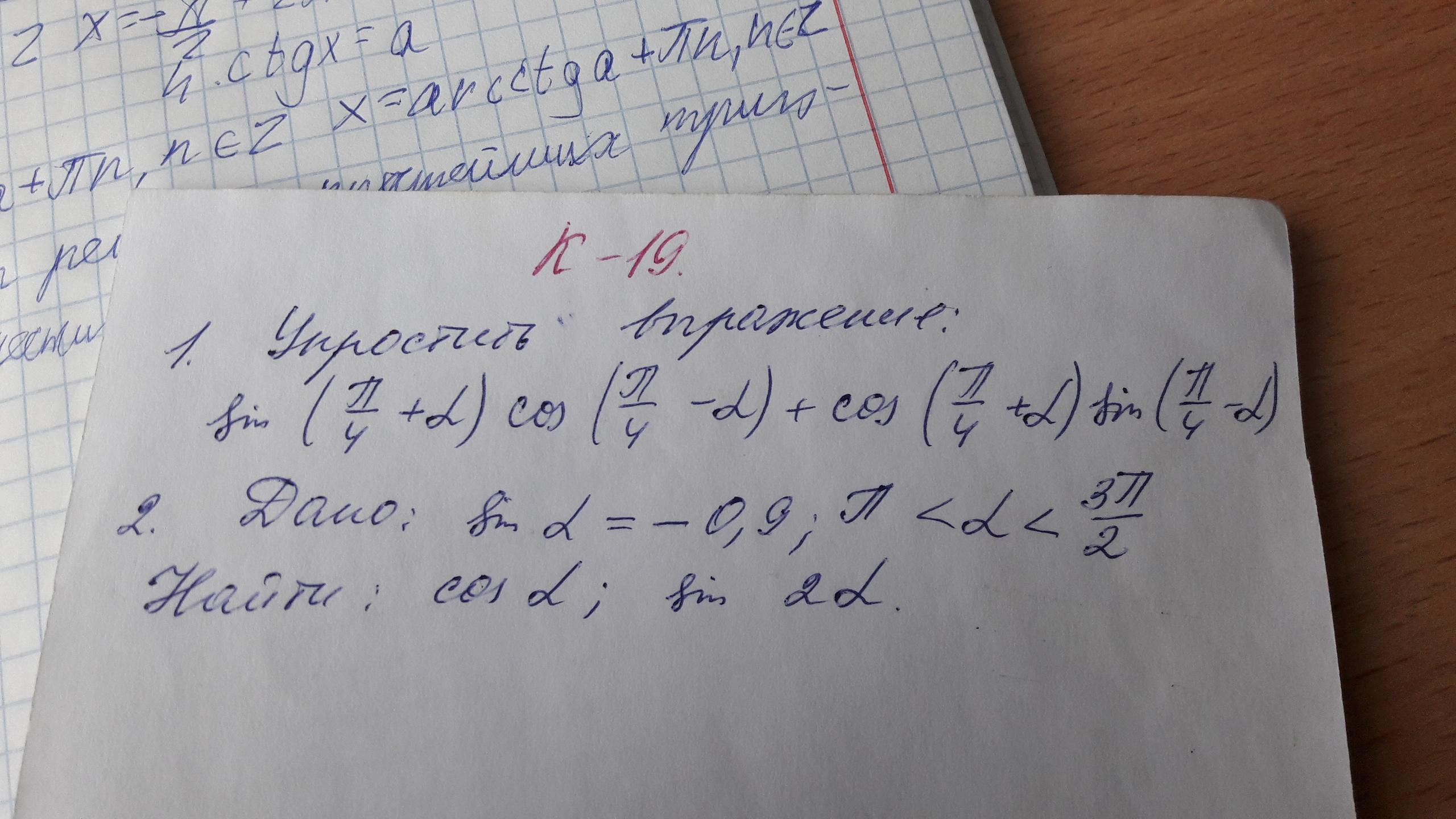 cosα=√1-sin²α=√1-(-0.9)²=-√0.19≈-0.43 знак минус, т.к. α∈(π;3π./2)
