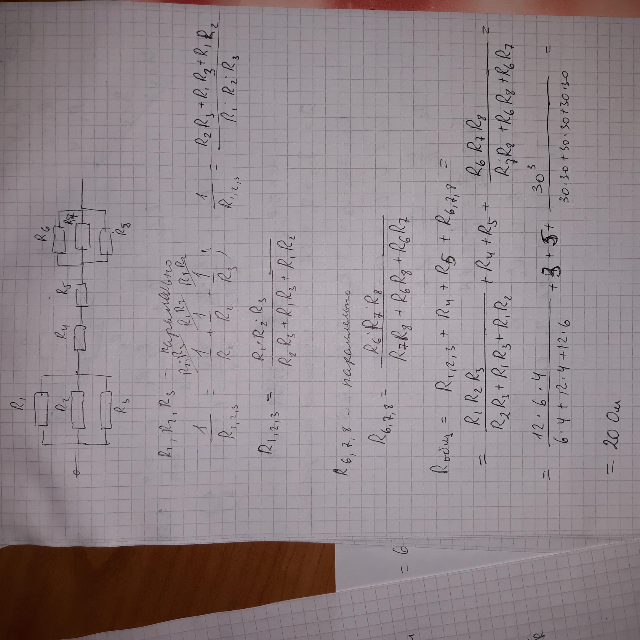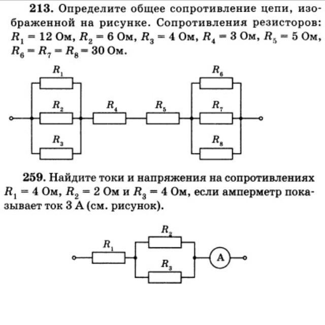 213. Определите общее сопротивление цепи, изо- браженной на рисунке. Сопротивления резисторов: R, = 12 Oм, R, = 6 Oм, R, = 4 Oм, R = 3 Oм, R, = 5 Ом, R. - R, - R. - 30 Ом.