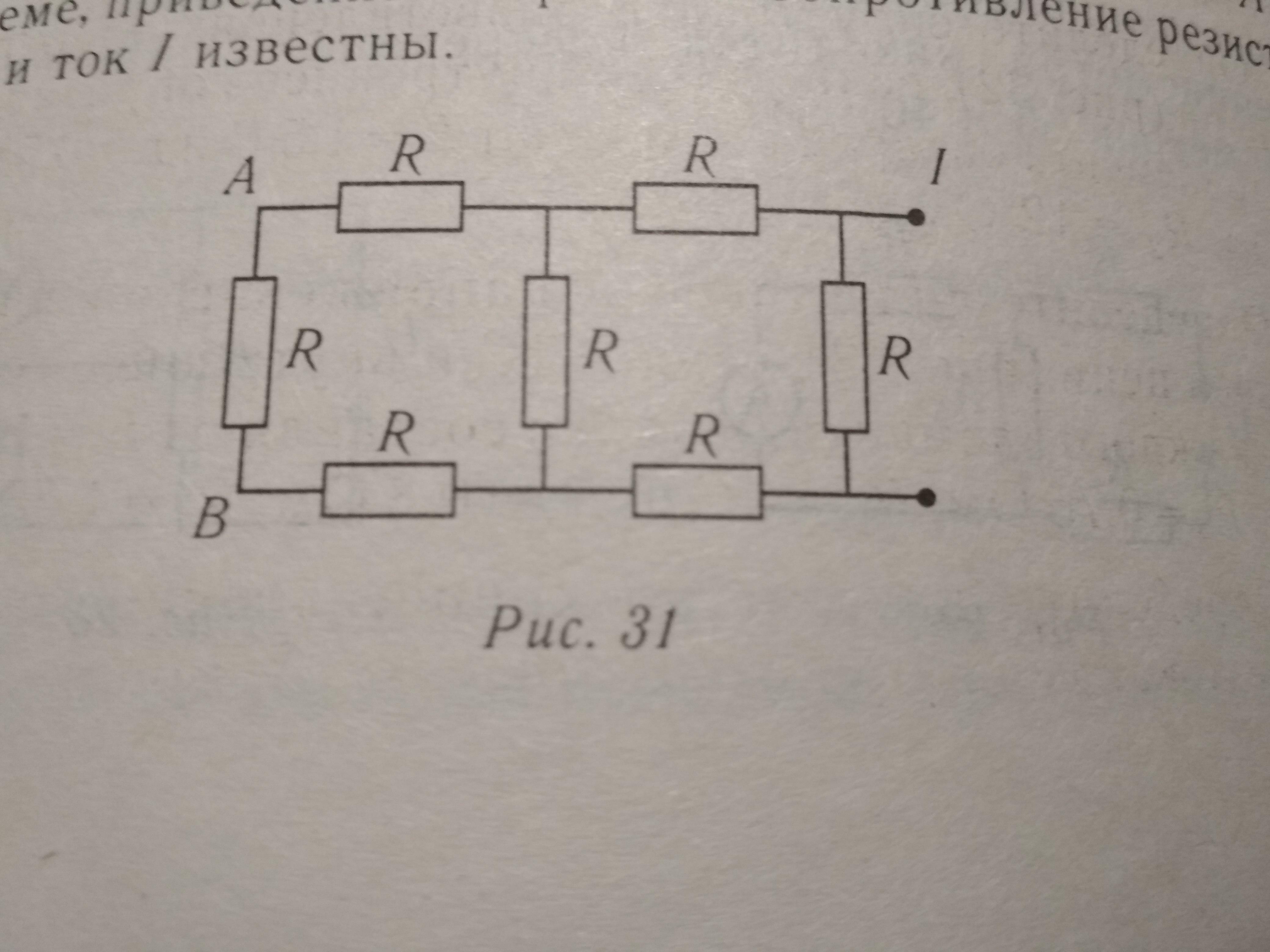 Определите напряжение U между точками A и B в схеме, приведенной на рисунке 31. сопротивление резисторов R ток и I известны