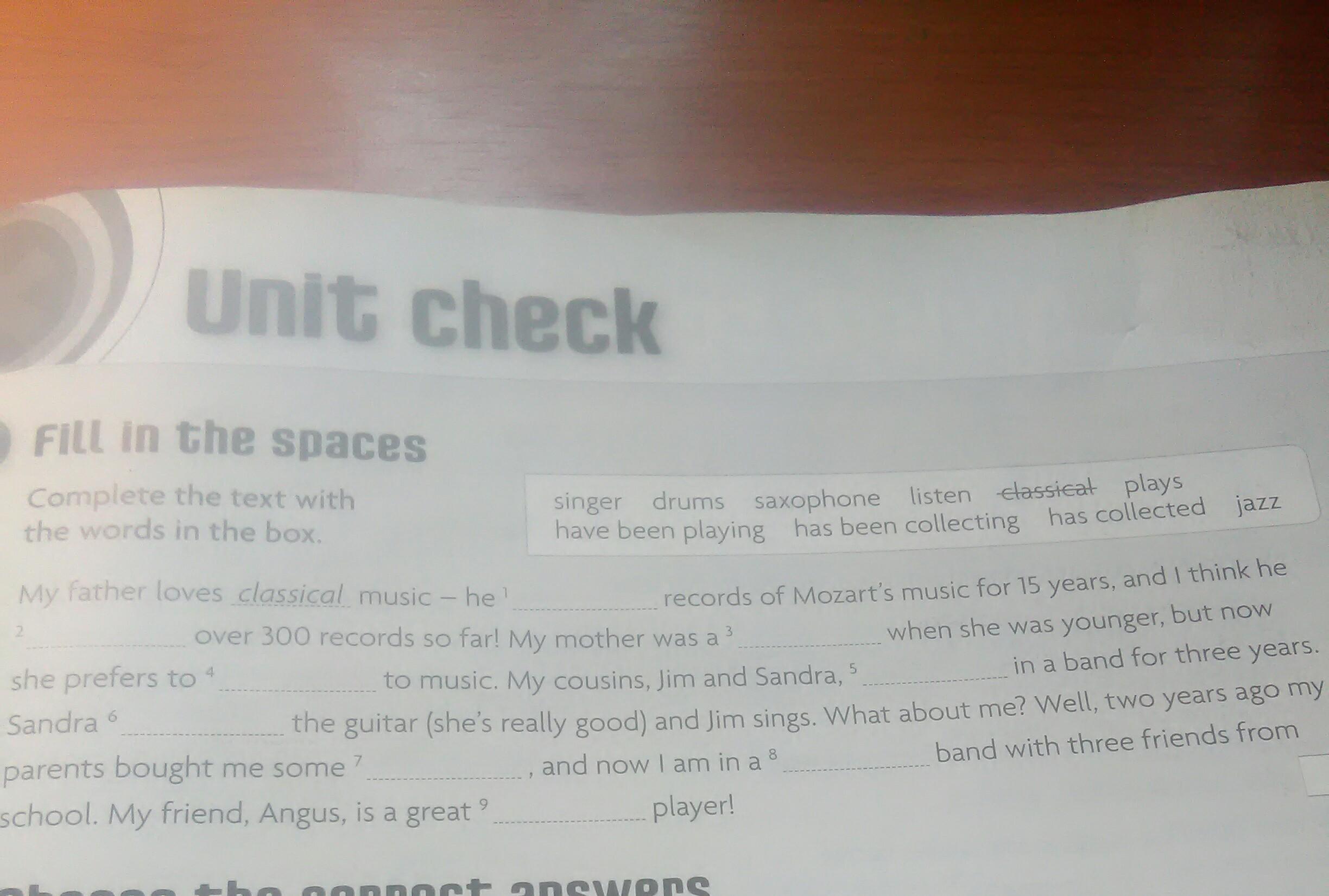 1 has been collecting 2 has collected 3 singer 4 listen 5 have been playing 6 plays 7 drums 8 jazz 9 saxophone