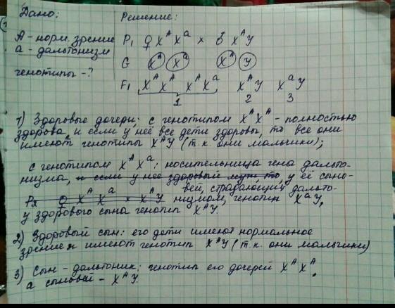 У супругов Маши и Олега, имеющих нормальное зрение, родились два сына и две дочери. У первой дочери зрение нормальное, но она родила 3 сыновей, 2 из которых дальтоники. У второй дочери и её пяти сыновей зрение нормальное. Первый сын Маши и Олега — дальтоник. Две его дочери и два сына видят нормально. Каковы генотипы всех указанных родственников? Доминантный признак нормальное зрение