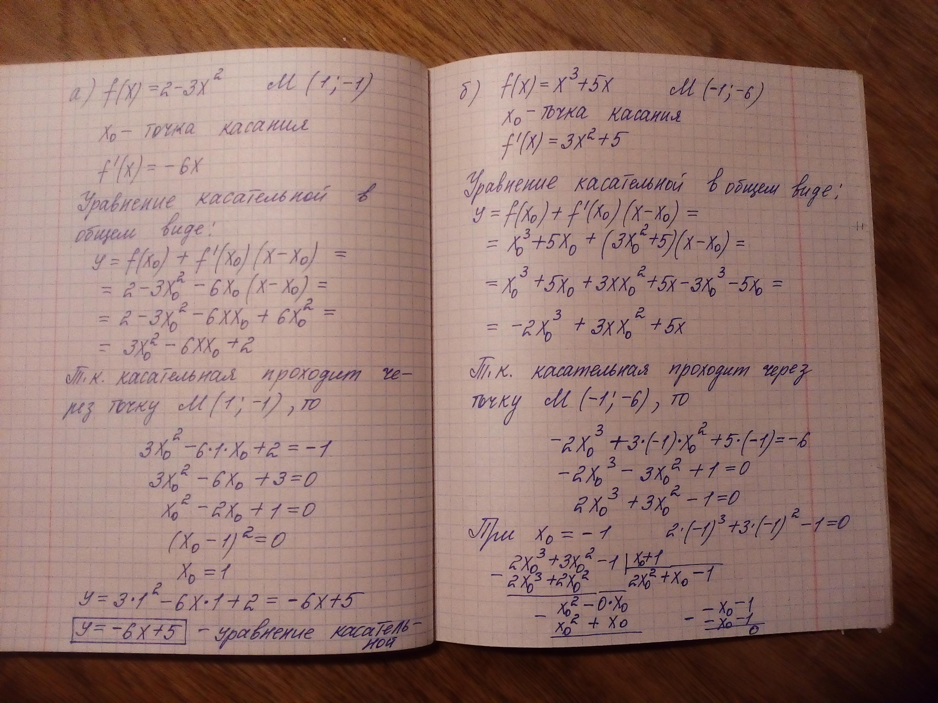 а) f(x)=2-3x^2, M=(1;-1) б) f(x)=x^3+5x, М=(-1;-6)