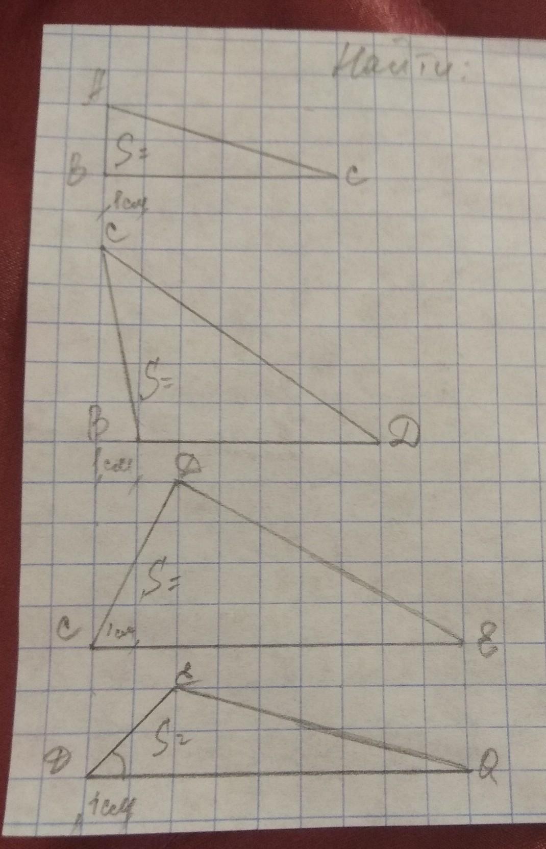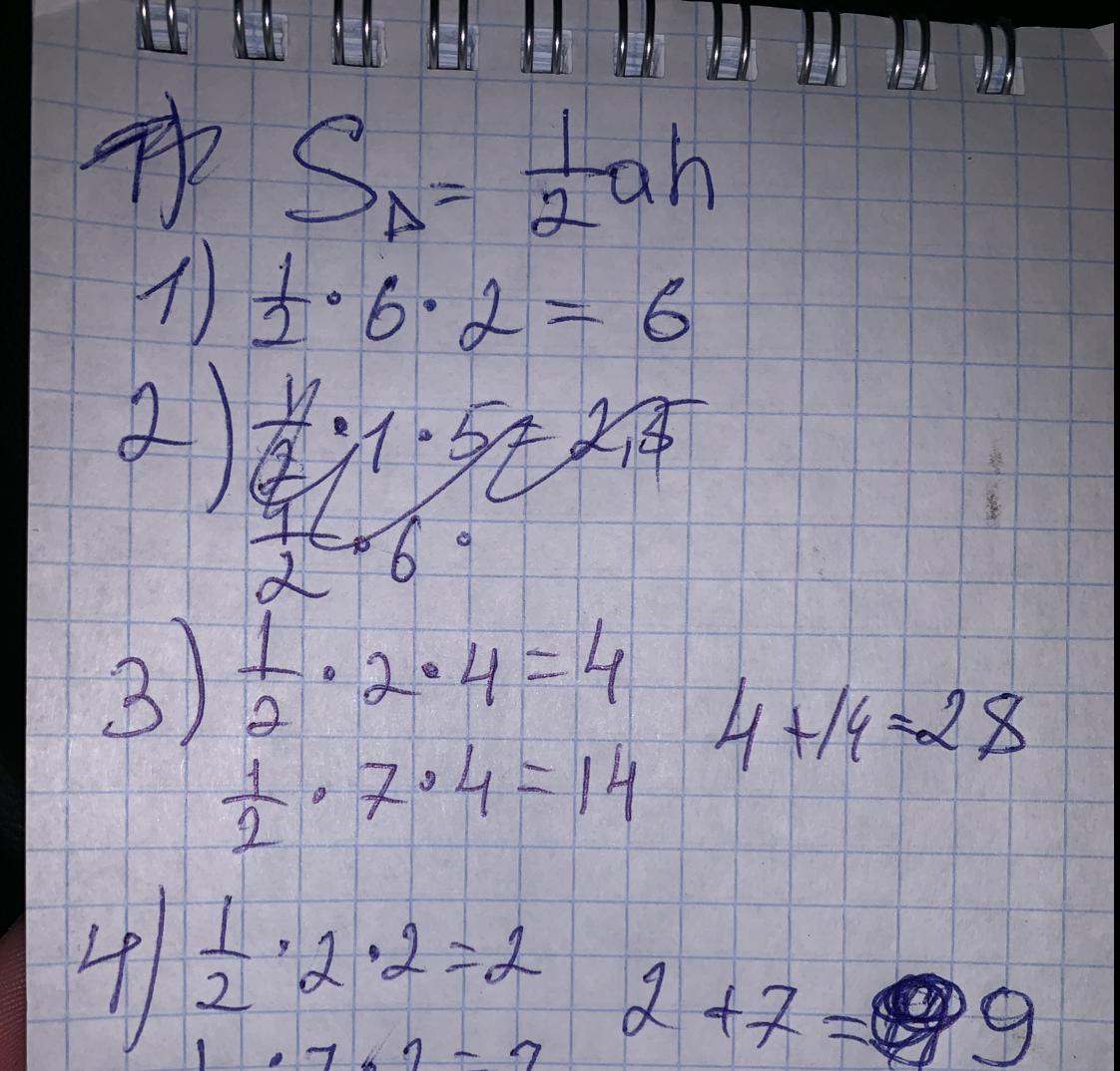 А второе достраиваешь до прямоугольника со сторонами 7и5 и его площадь равна 45 и отнимаешь два треугольника которые получились они будут 22,5 и 2,5 итого наш треугольник будет 20