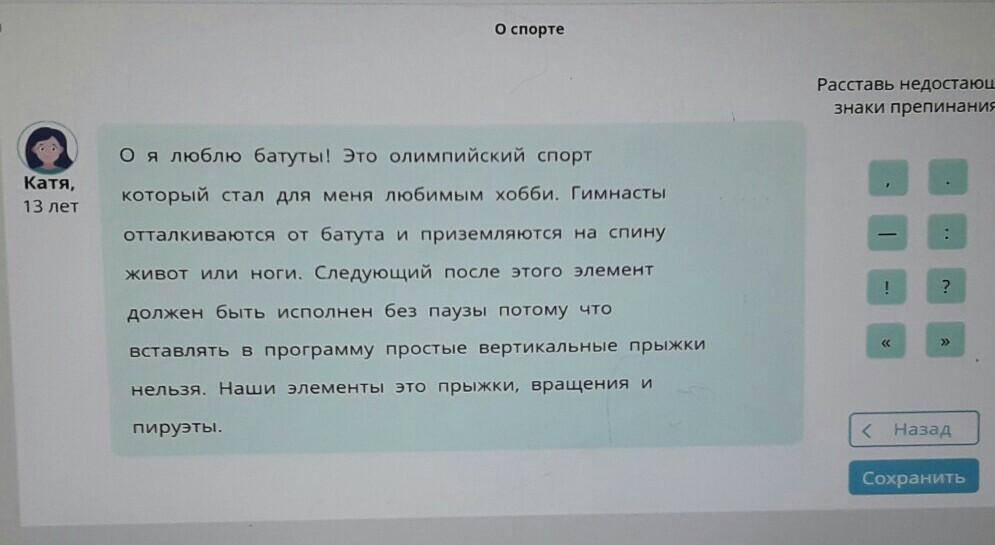 О, я люблю батуты! Это олимпийский спорт, который стал для меня любимым хобби. Гимнасты отталкиваются от батута и приземляются на спину, живот или ноги. Следующий после этого элемент должен быть использован без паузы потому, что вставлять в программу простые вертикальные прыжки нельзя. Наши элементы это: прижки, вращения и пируэты.