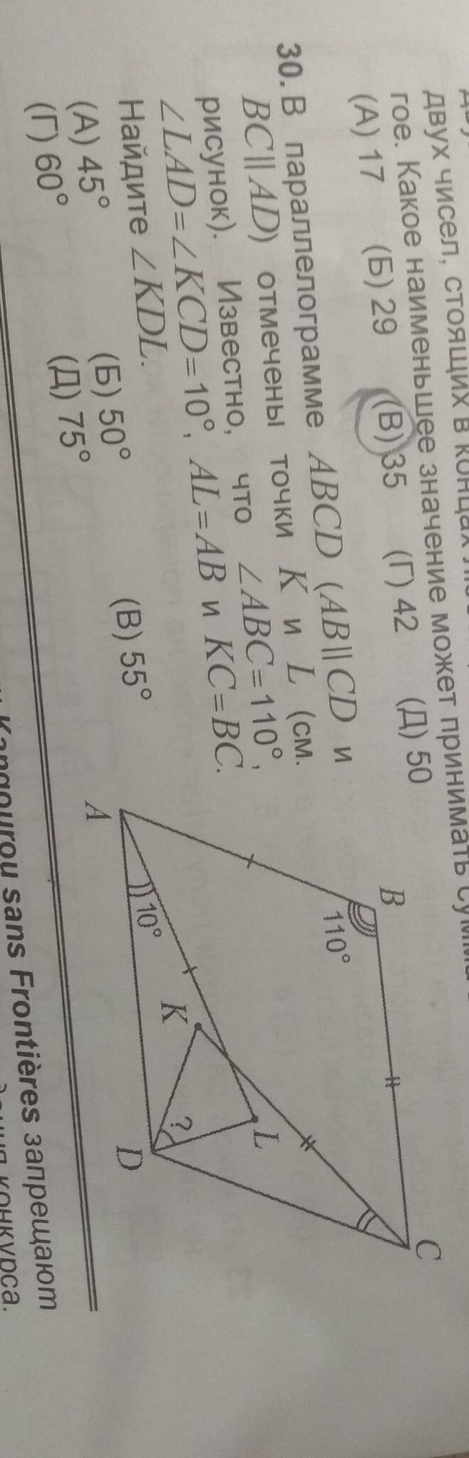 Тогда ∠LAB = 70° — ∠LAD = 70° — 10° = 60° и ∠LAB = ∠KCB.