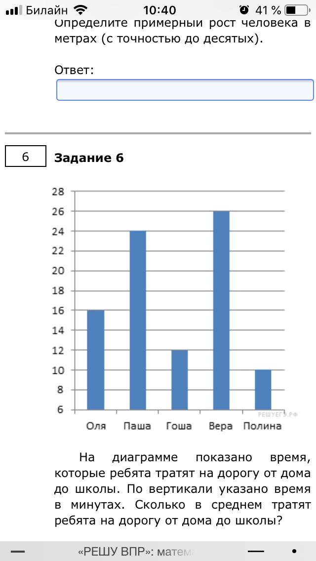 На диаграмме показано время, которые ребята тратят на дорогу от дома до школы. По вертикали указано время в минутах. Сколько в среднем тратят ребята на дорогу от дома до школы?