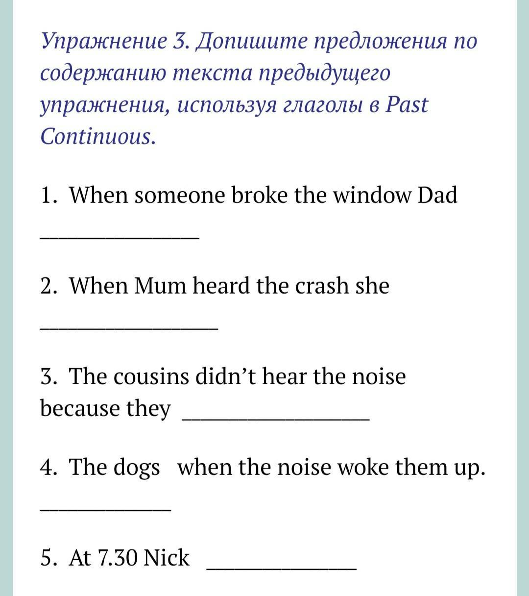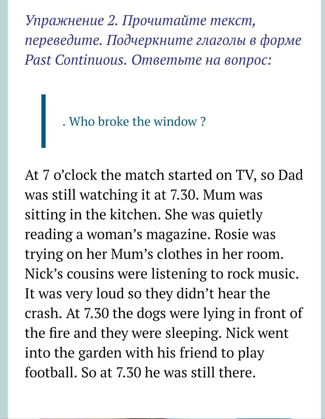 At 7 o'clock the match started on TV, so Dad was still watching it at 7.30. Mum was sitting in the kitchen. She was quietly reading a woman's magazine. Rosie was trying on her Mum's clothes in her room. Nick's cousins were listening to rock music. It was very loud so they dodn't hear the crash. At 7.30 the dogs were lying in front of the fire and they were sleeping. Nick went into the garden with his friend to play football. So at 7.30 he was still there.