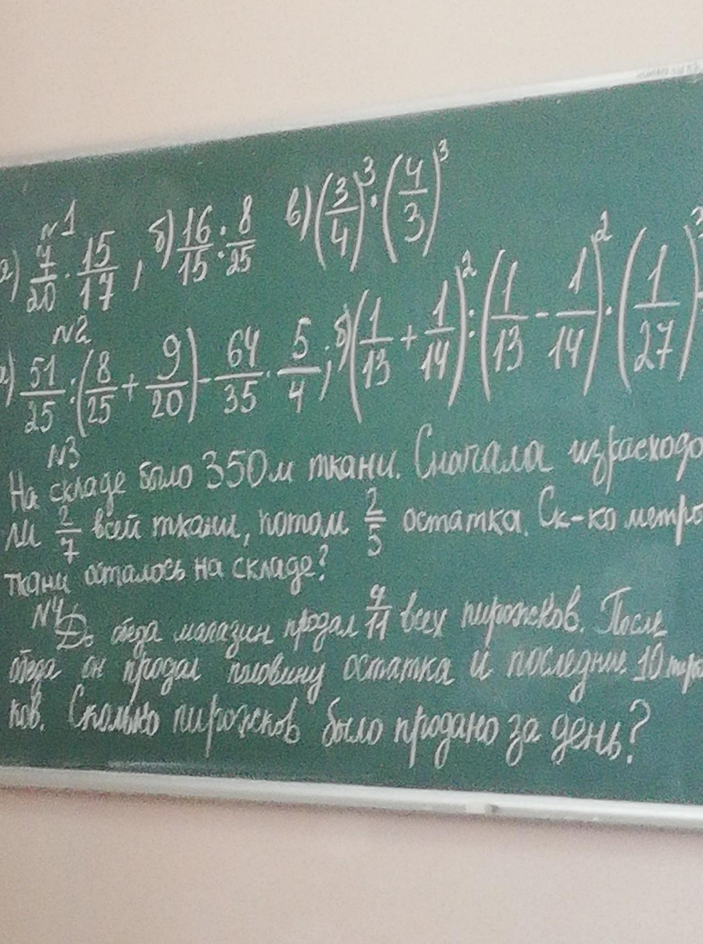 1. а) 21/68. б) 10/3. в) 1. 2. а) 51/25 * 100/77 - 16/7=4/11. б) (27/182 * 1/182 * 1/27)²=1. 3) 350=7/7. 1/7=50. Использовали 2/7, значит 100 метров ткани, осталось 250. 250=5/5, 1/5=50, использовали 2/5, значит 100 метров. 350-(100*2)=150 метров ткани осталось. 4) 11/11 - все пироженые, 7/11 уже продано, осталось 4/11, 2/11 осталось и 2/11 продано, 2/11 - это 10 пирожков, значит 10: 2/11=55 пироженых магазин продал за весь день.