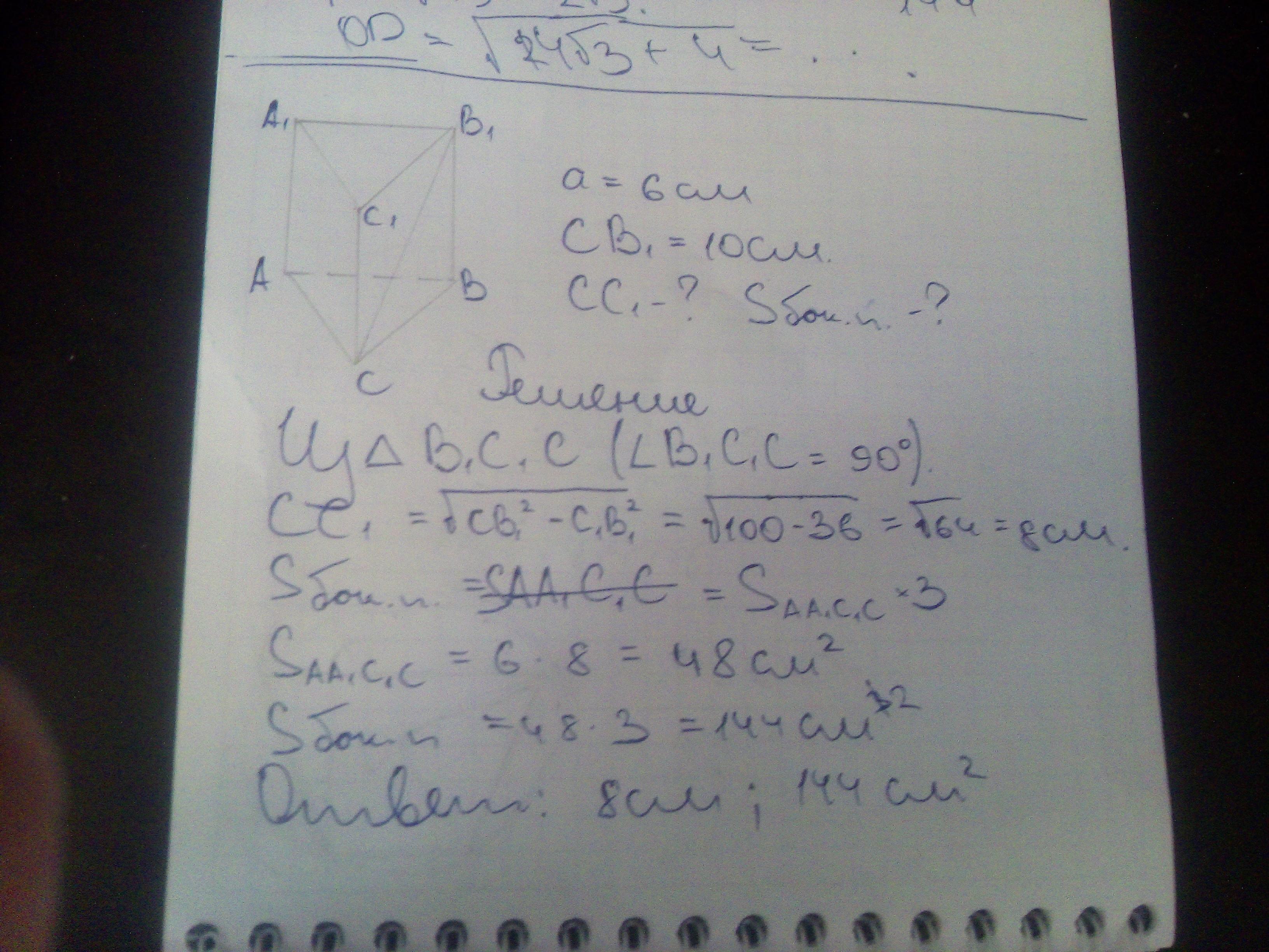 Сторона основания правильной треугольной призмы равна 6см, а диагональ бок. грани 10см. Найти высоту призмы и площадь боковой поверхности призмы.