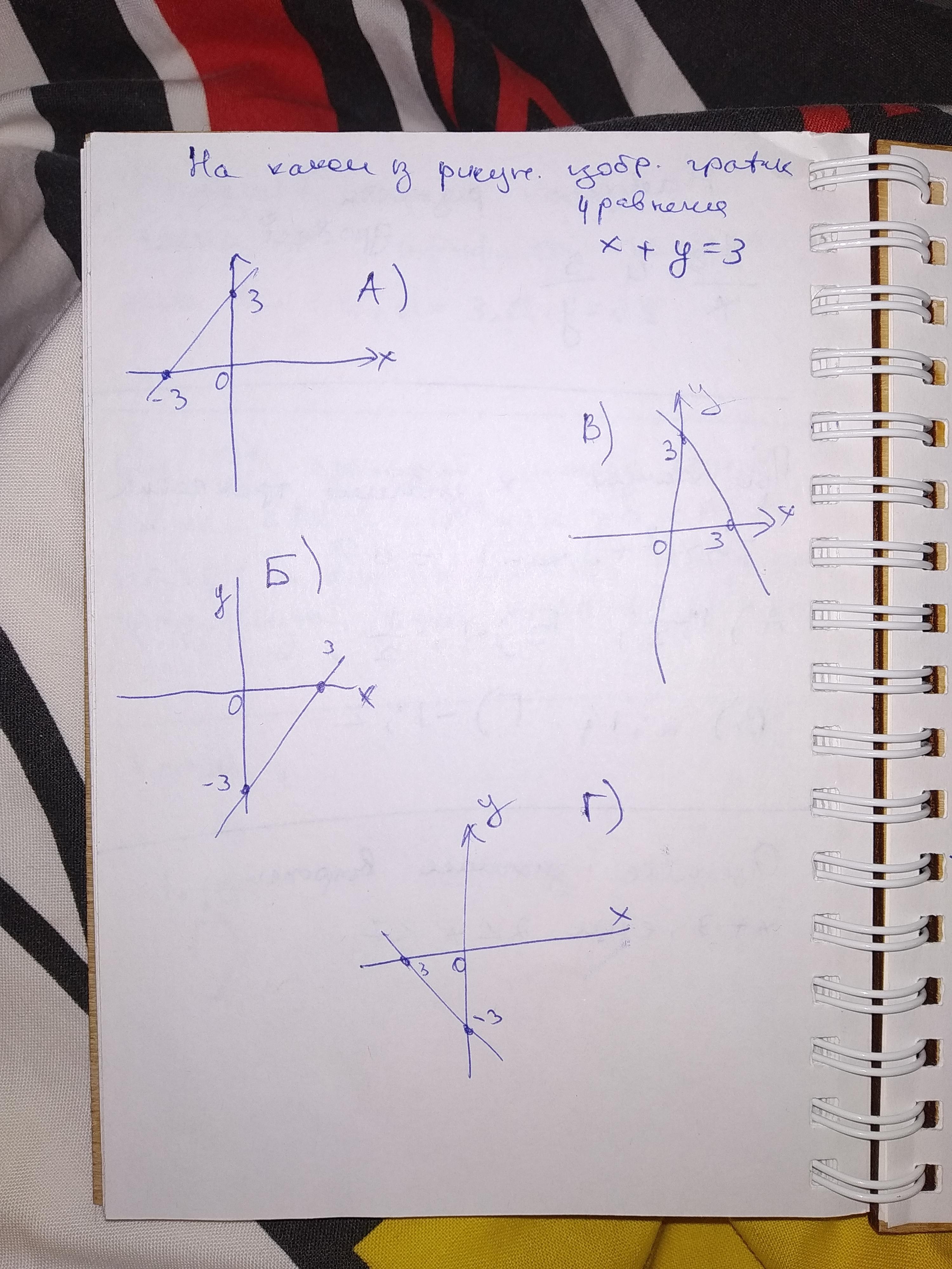 k (коэффициент при х) отрицательный, следовательно угол наклона к положительному направлению оси 0х будет больше 90°. Подходят графики В) и Г). b- точка пересечения с осью 0у. b=+3. Наш график будет В)
